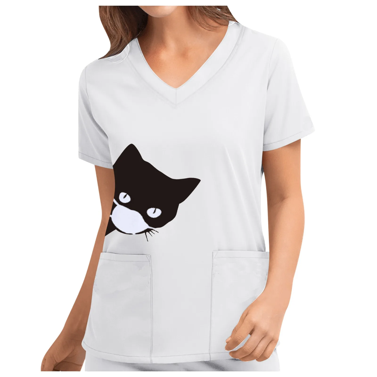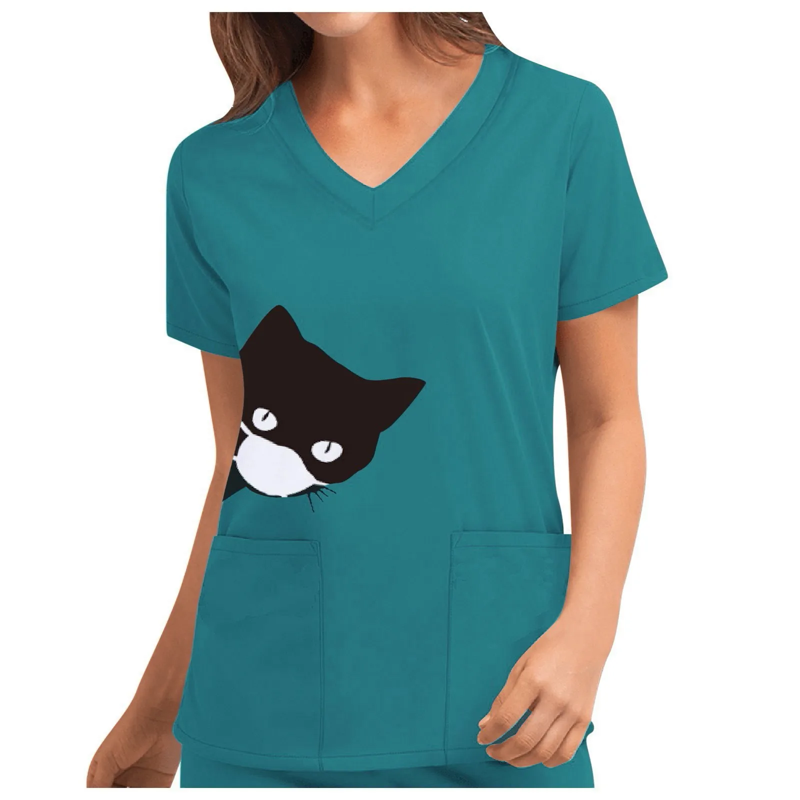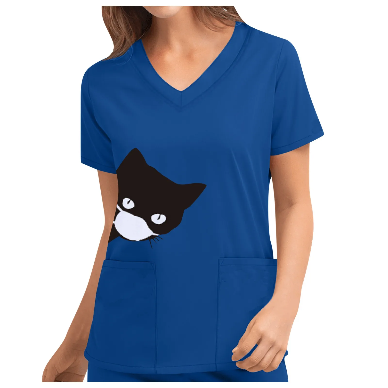 Летняя женская Рабочая форма для женщин с рисунком кота v-образный вырез с коротким рукавом рубашки карман блузки работа блузка скрабы красота футболки для домашних животных