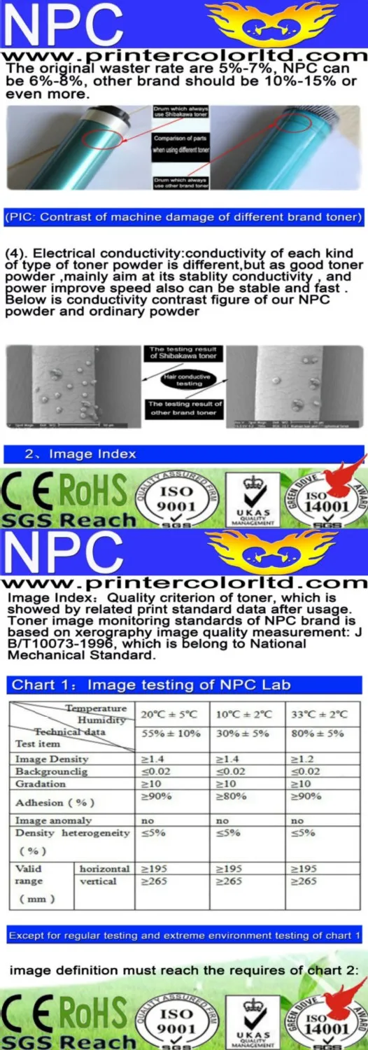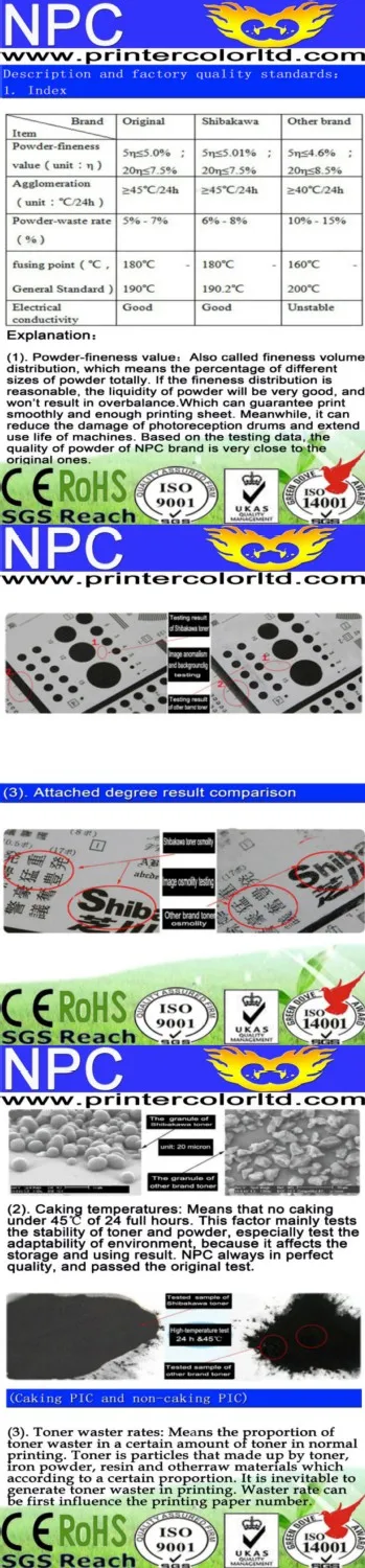 7. Все Тонер-порошок проводится один за другим в вакуумной утечки испытательных машин, чтобы обеспечить отсутствие утечки во время доставки8. Черного цвета, резкость эффекта печати может соответствовать или превосходить OEM9. Строгий контроль качества во время производства и 100% тест на печать перед отправкой