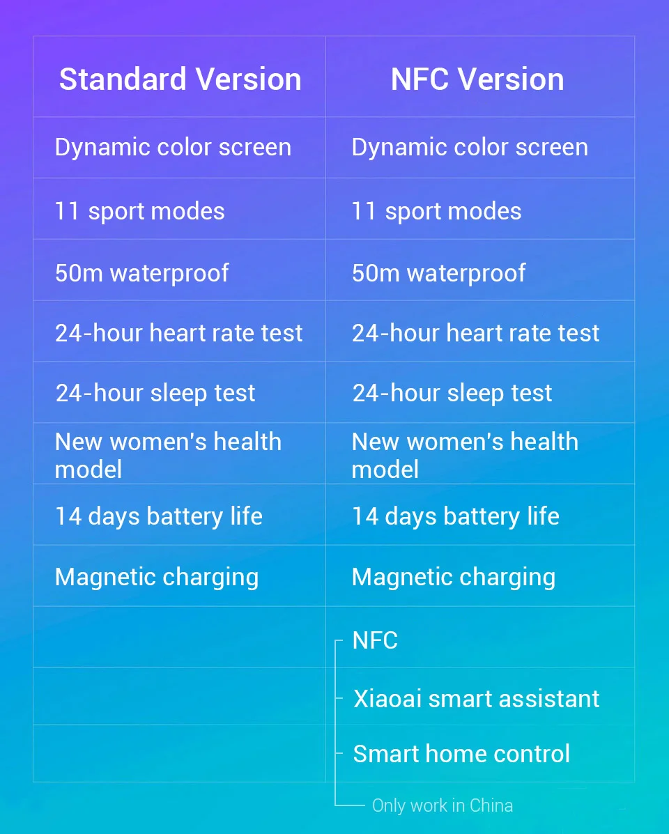 В: каковы различные версии mi band 5? О: есть Базовая версия и версия NFC, только версия NFC поддерживает NFC (функция NFC работает только в Китае) и функция голосовой помощи xiaoai (голосовая помощь только на китайском языке)