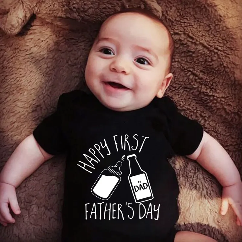 Счастливы во-первых с принтом для маленьких мальчиков и девочек, для новорожденных, для малышей с короткими рукавами; Детский хлопковый облегающий Father's Day комбинезон летней детской одежды, повседневная одежда