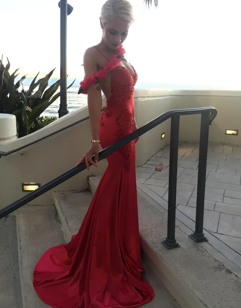 Женское длинное вечернее платье-русалка, красное платье на тонких бретельках с открытой спиной, со шлейфом и аппликацией из бисера, бальное платье для выпускного вечера