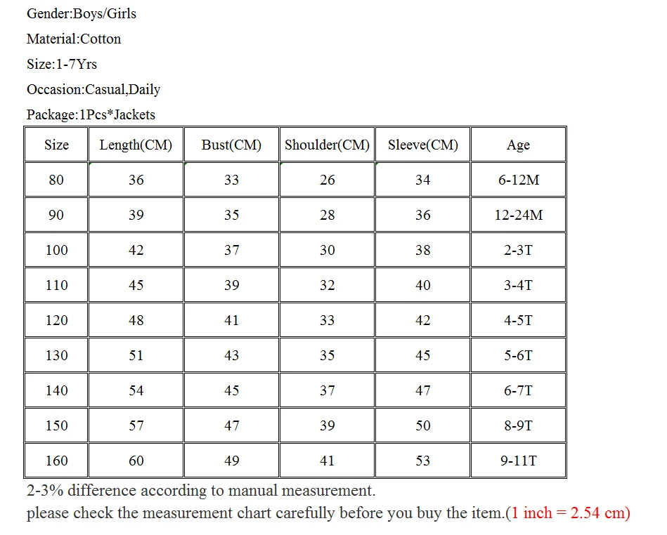 Детская хлопковая куртка с длинным рукавом, на возраст 1-12 лет