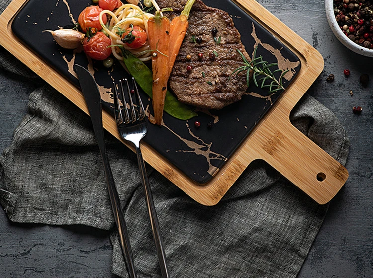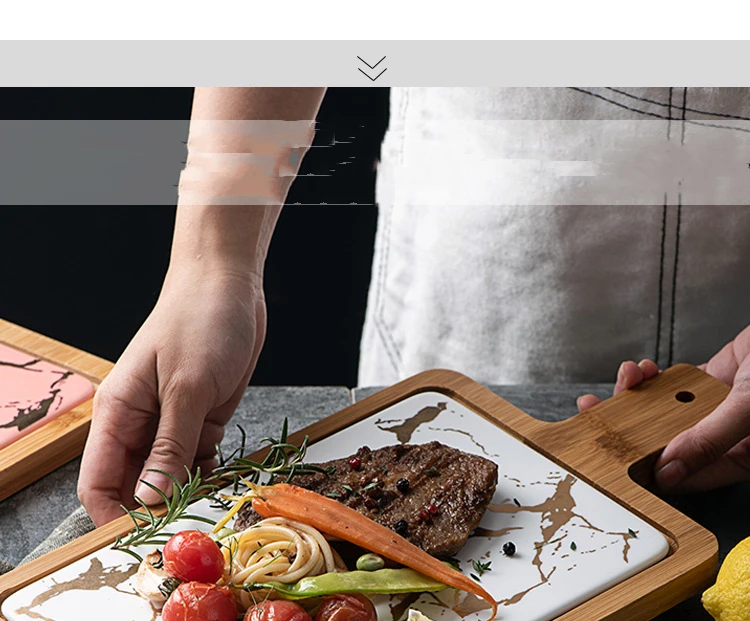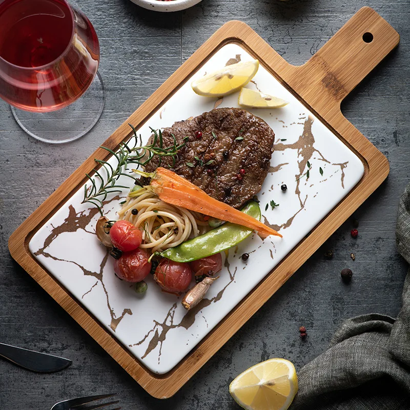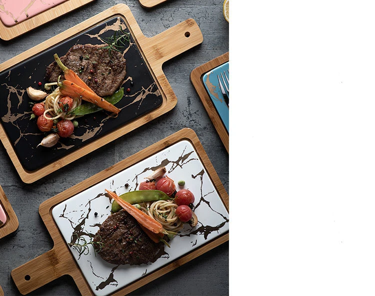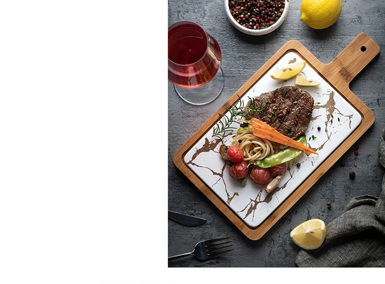 Керамическая и деревянная прямоугольная обеденная тарелка с ручкой для стейка, десерта, суши, торта, сервировочный лоток, столовая посуда