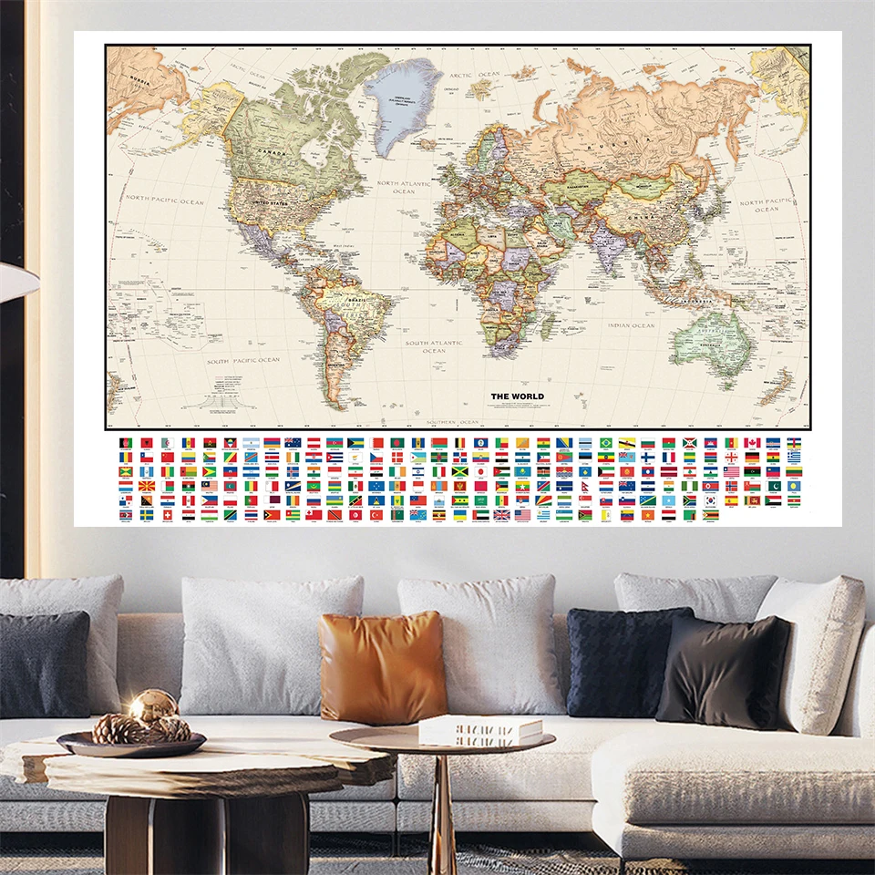 225*150 см политическая карта мира с национальными флагами Винтаж нетканый холст картины большой плакат школьные принадлежности, домашний декор