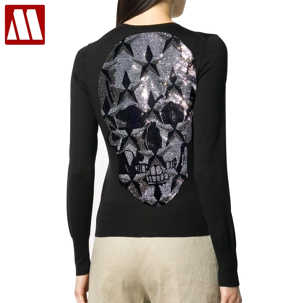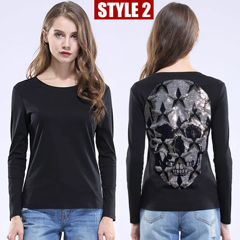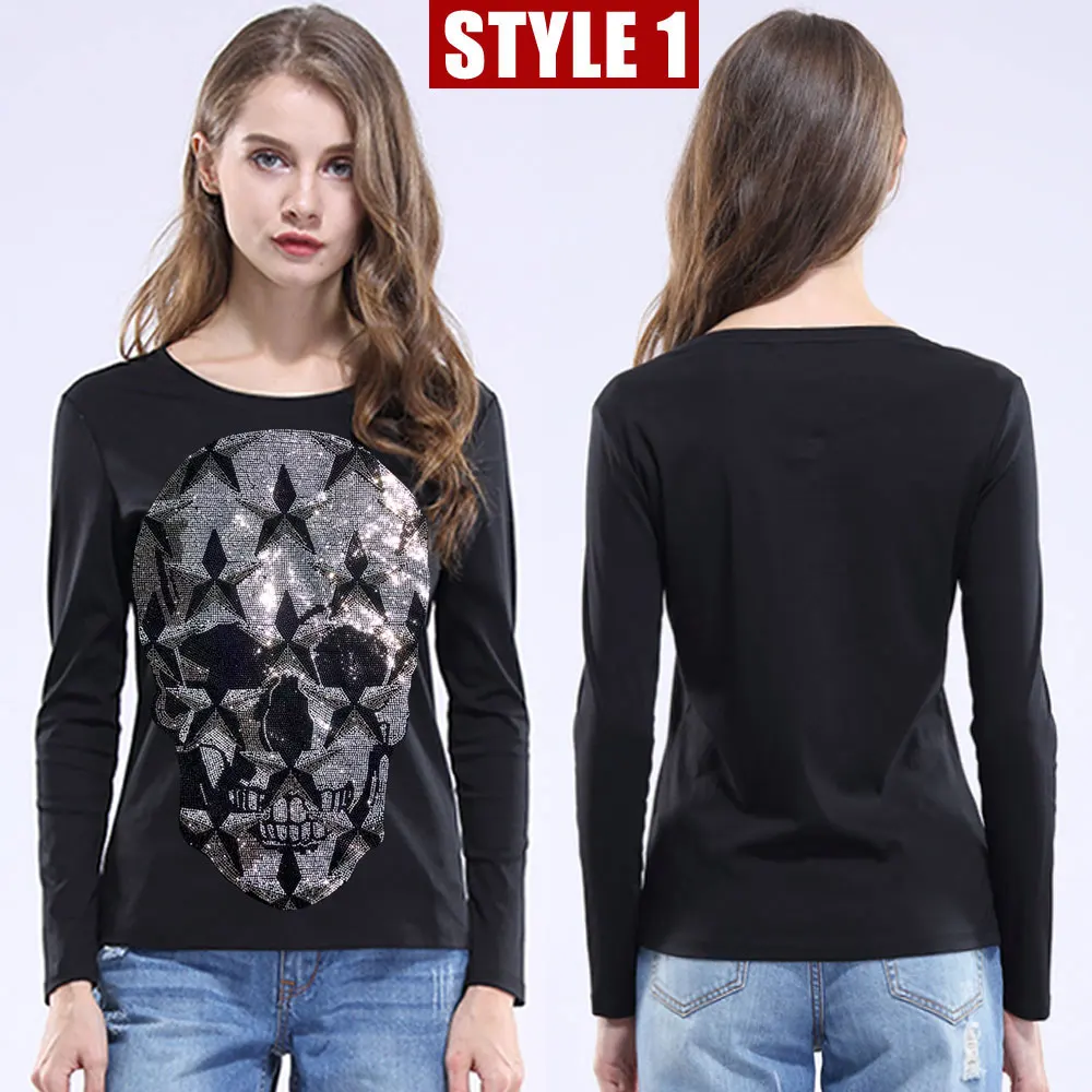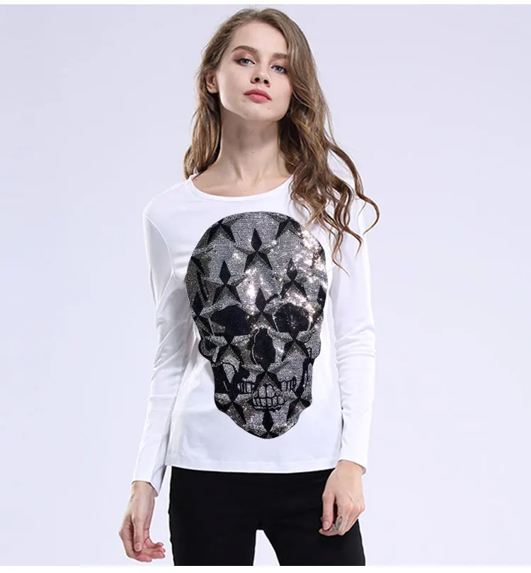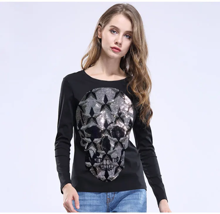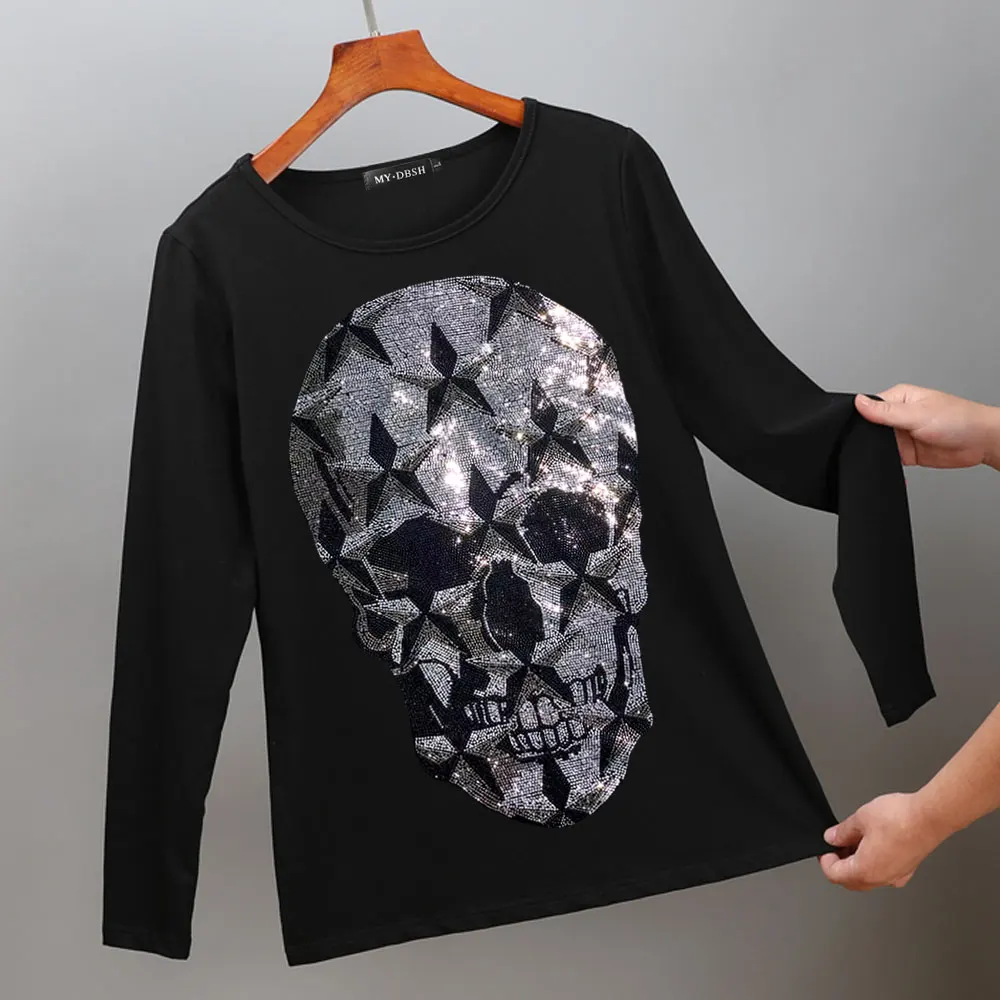 Женская черная футболка, Повседневная рубашка с длинным рукавом, Женская 2022, весна-лето, футболка со звездным черепом, стразы, футболки, женская уличная одежда