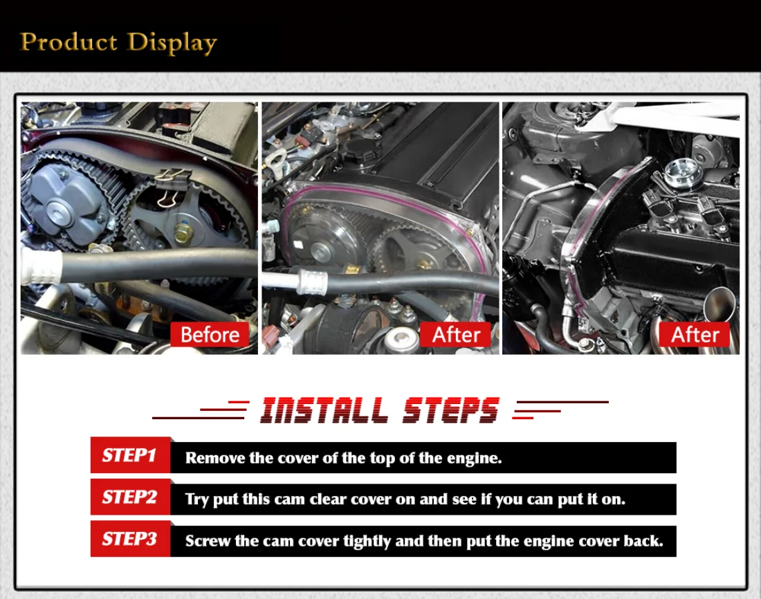 100% гарантия качества протестирована, более отзывчива, дешевле, проще в установке.Прозрачная крышка камеры почти точно дублирует заводскую часть.Высокая термостойкость и устойчивость к коррозии.Последний тренд в изменении автомобиля.Можно проверить, повреждены ли ремни ГРМ.Может обнаруживать любые сломанные ремни из-за утечки масла.Улучшает видимость двигателя.Уменьшить сложность ремонта двигателя.Улучшенный опыт жизнестойкости двигателя.Рекомендуется для использования регулируемого кулачкового шкива.