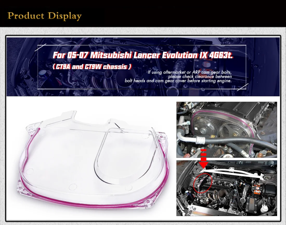 Для 05-07 Mitsubishi Lancer Evolution 9 IX 4G63t.(шасси CT9A и CT9W)При использовании aftermarket или ARP cam gear болтов, пожалуйста, проверьте зазор между головками болтов и крышки кулачкового редуктора перед запуском двигателя. Пожалуйста, будьте внимательны при очистке чистой камеры и используйте только воду и Мягкое мыло без amonia.