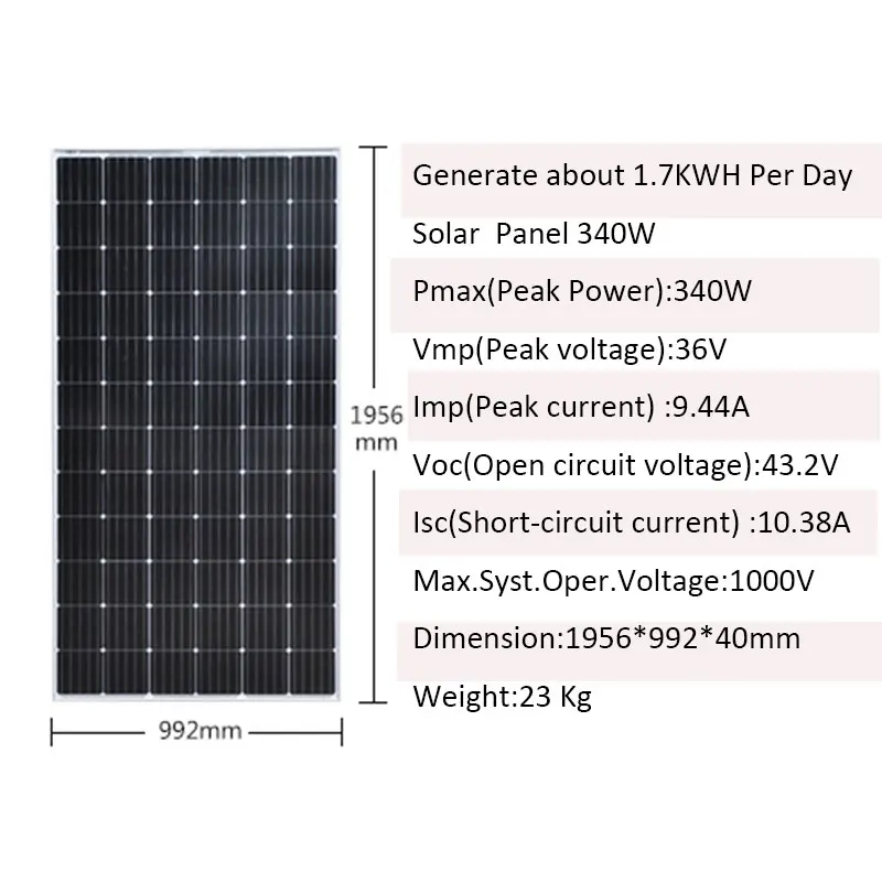 Во-первых, учитывайте Размер. Каждый солнечный модуль 340 Вт составляет 2 квадратных метра в полу и около 3 квадратных метров в крыше виллыВторое. Рассмотрим выход. Каждая солнечная панель может работать около кВт/ч в день.3. 10 шт. солнечной панели 340 Вт заменены. Это составляет около 20 квадратных метров и 16 кВт/ч в день. Удовлетворить потребности в доме