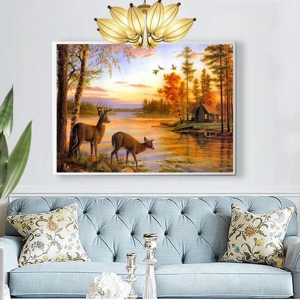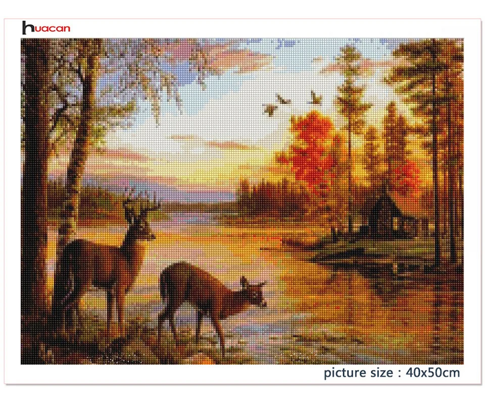 Алмазная живопись Huacan, квадратнаякруглая мозаика с оленем, Осень-зима, искусственное животное
