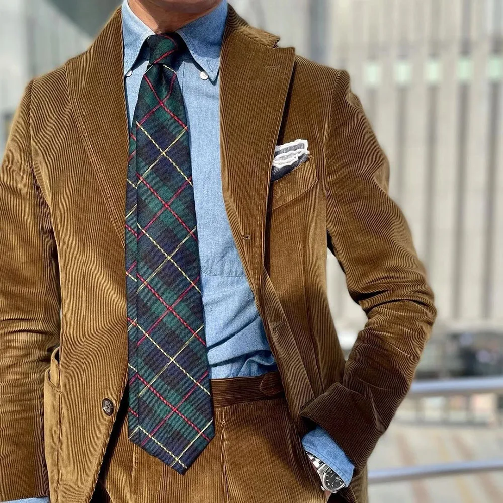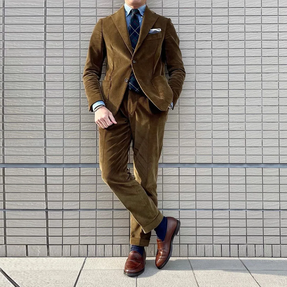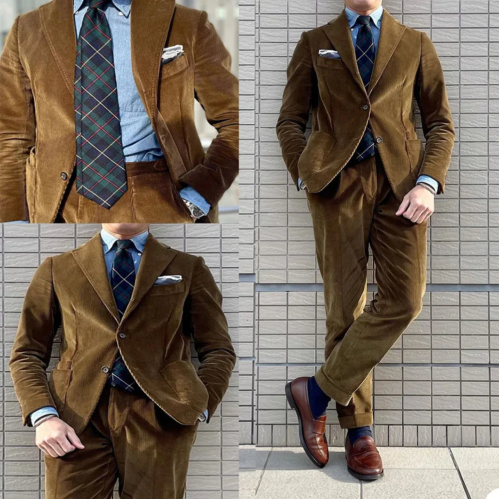 Классические дизайнерские Коричневые Вельветовые мужские костюмы с отложным воротником с вырезом, блейзер для лучшего мужчины, одежда для жениха, облегающая куртка из 2 предметов с брюками, смокинг 2021