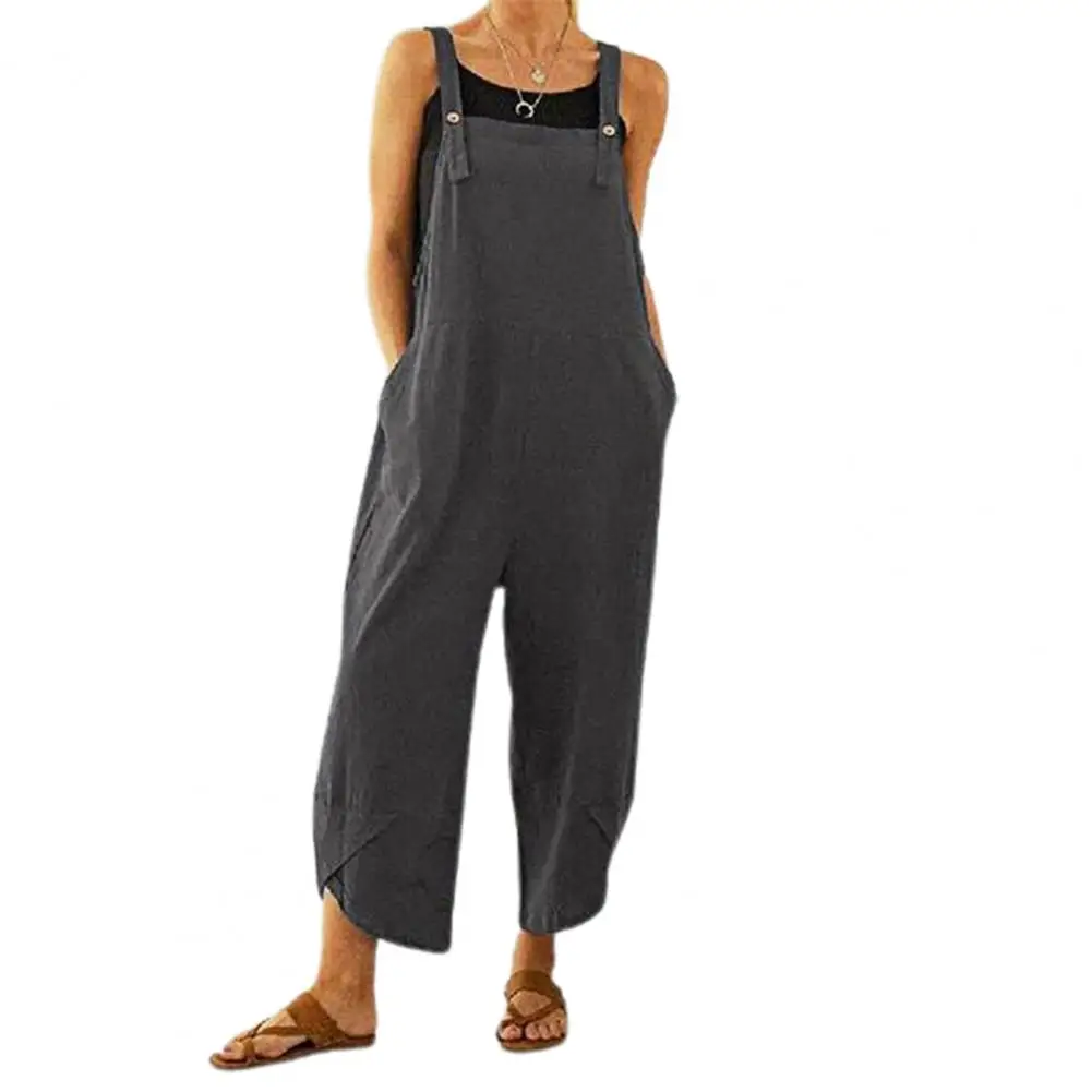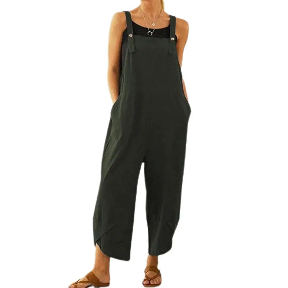 Женский комбинезон из смеси хлопка, однотонный Свободный комбинезон с карманами и лямками на плече, комбинезон с асимметричным вырезом для ног, 2021
