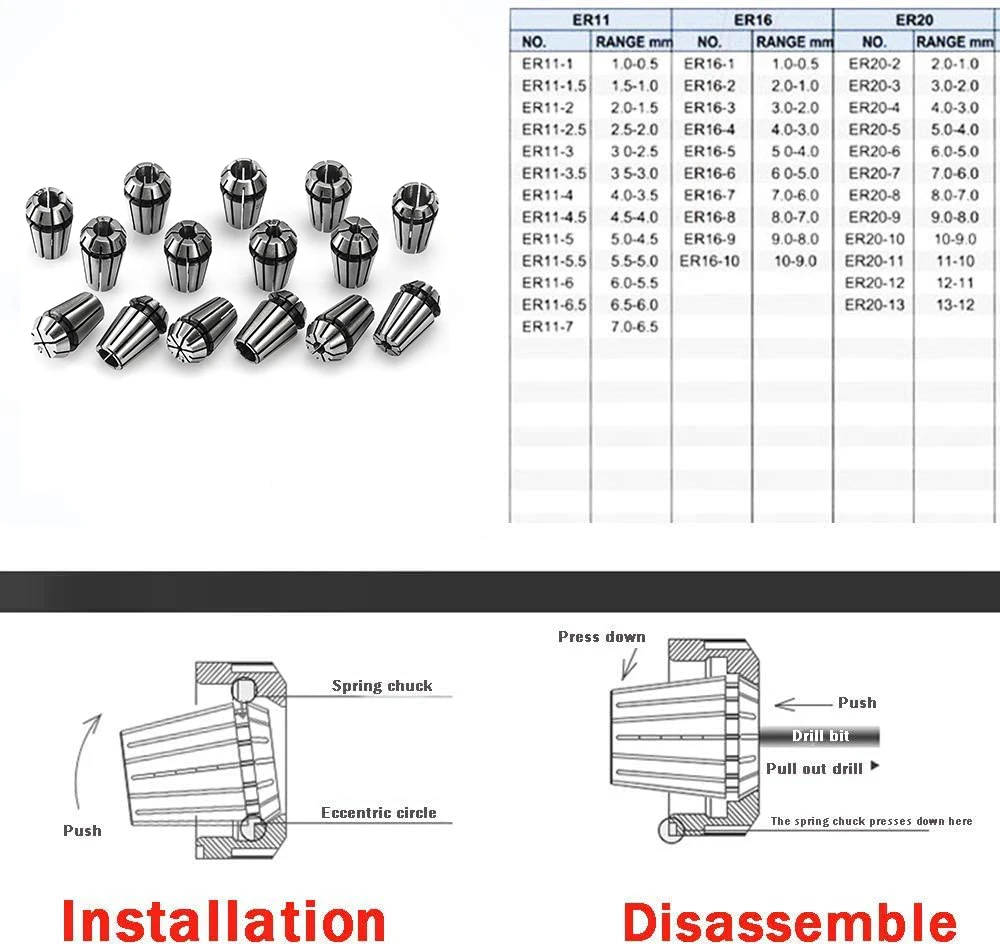 Высокоточный набор цанг ER11 закаленный, точная шлифовка и Точность составляет 0,02 мм (0,0008 дюйма).