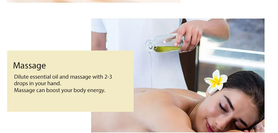 Массаж-Наши масла сильны, поэтому, пожалуйста, не используйте их непосредственно на вашей коже. Добавьте несколько капель в масло-носитель (например, масло грейпса), иЗатем массируйте его на лбу, ладонях, шее, спине, ногах или других пораженных областях, творите чудеса.