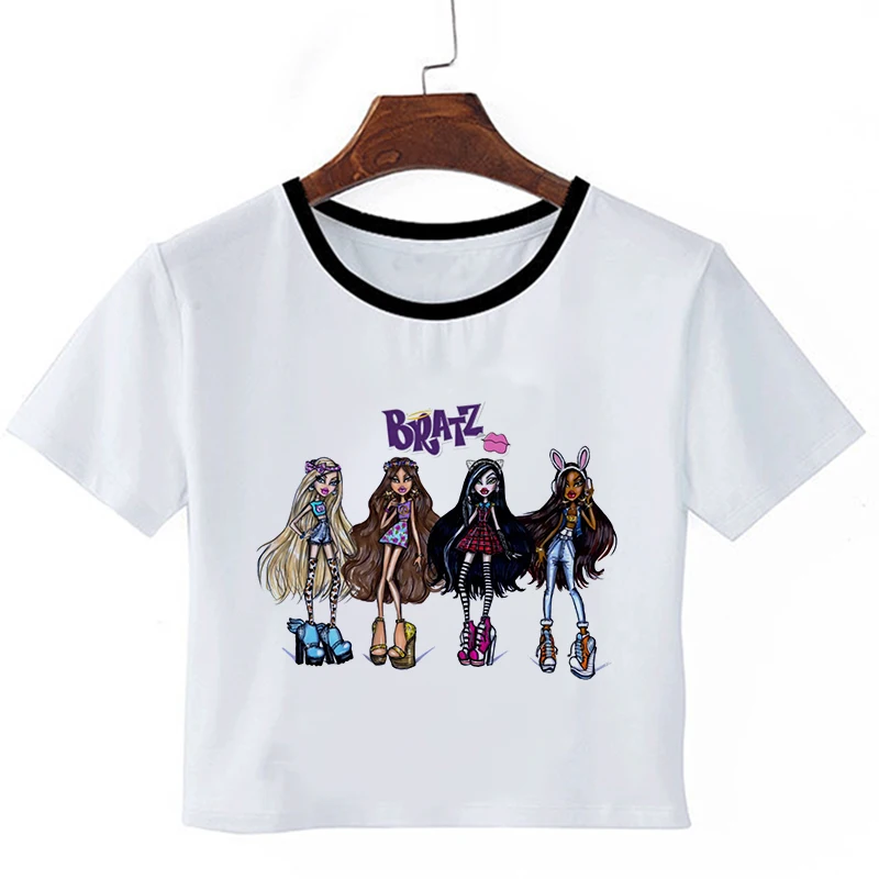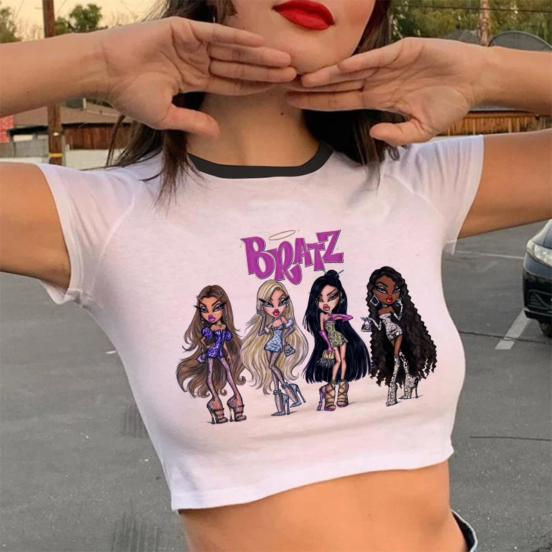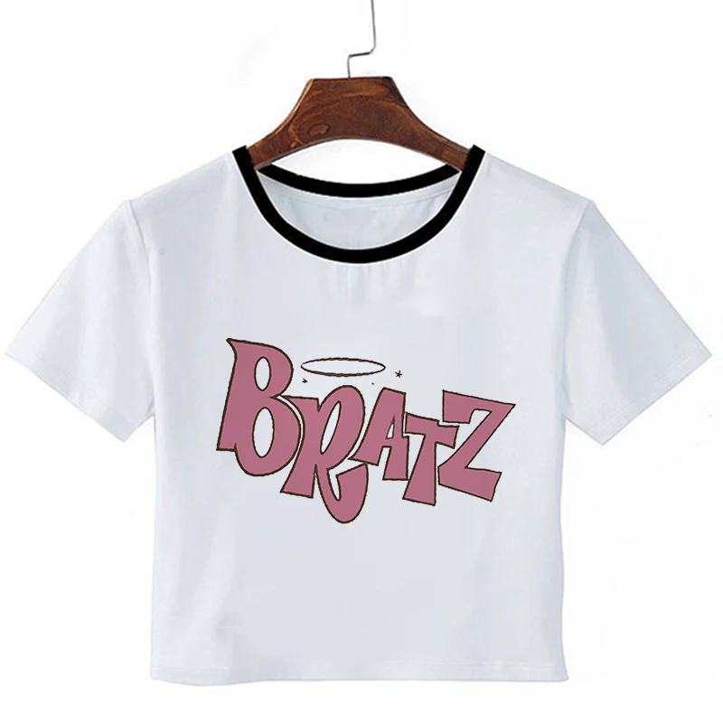 Женский топ из 90-х Винтаж Футболка Bratz Одежда Harajuku черный вырез, футболки с короткими рукавами с надписью BRATZ печатных детская футболка с надписью Y2k женский