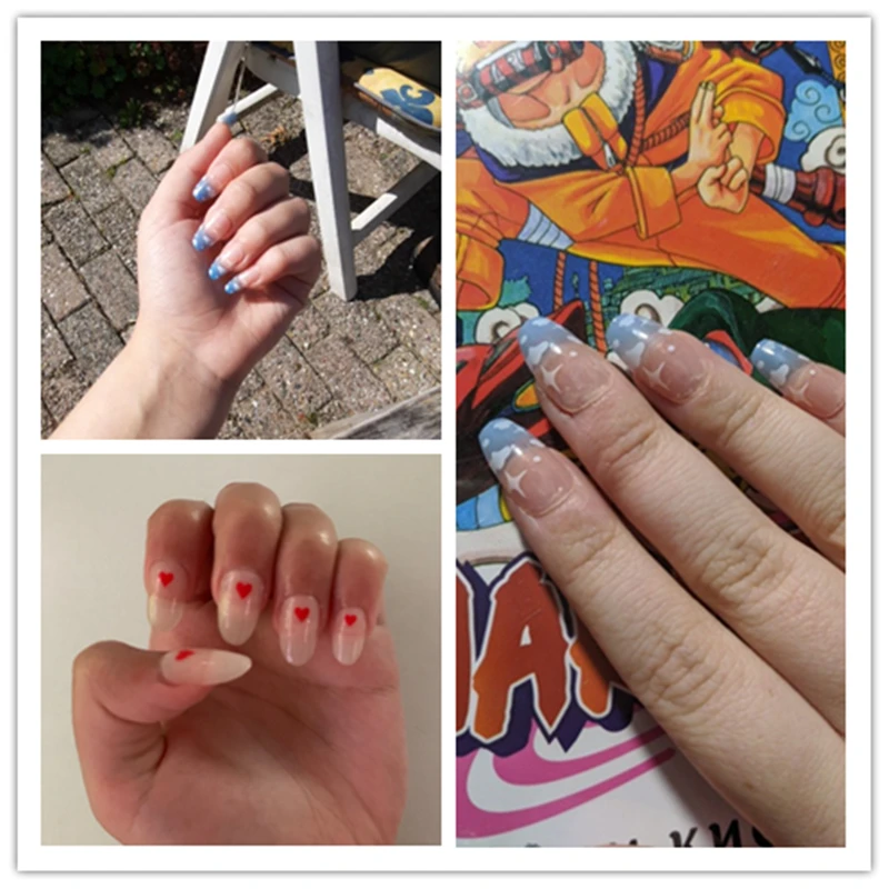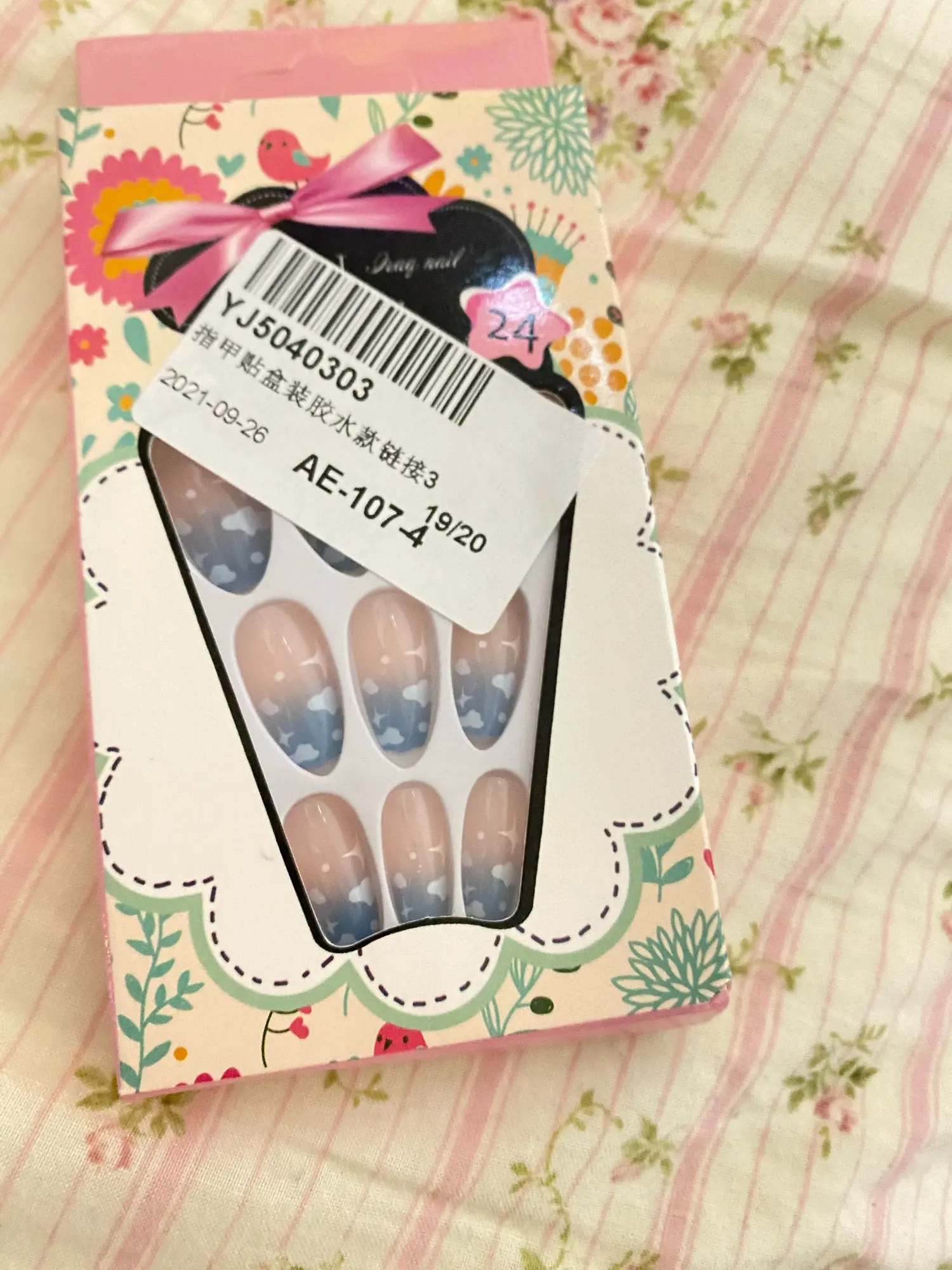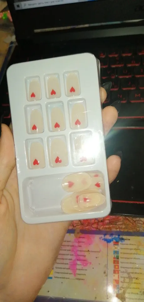 очень хорошие накладные ногти, подходят под каждый палец, есть запасные ещё, но они меньшего размера, либо на маленькую руку, либо ребёнку могут подойти, смотрятся очень хорошо