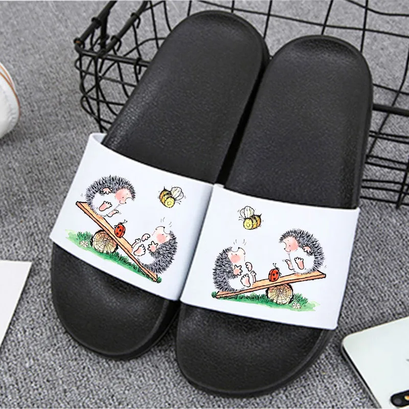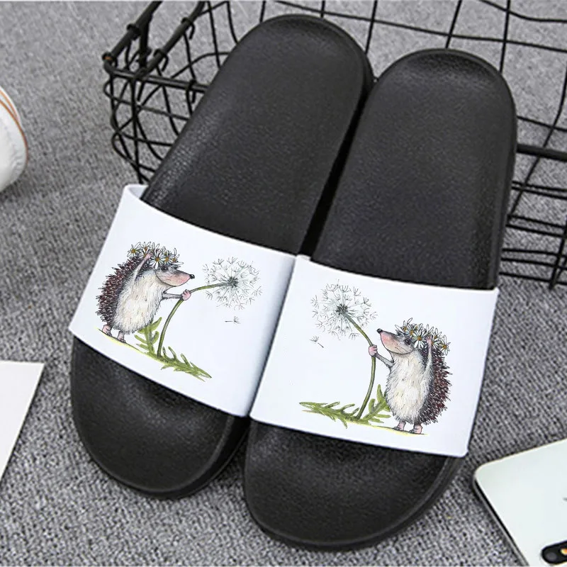 Шлепанцы женские с рисунком ежа, Симпатичные домашние тапочки, пляжные сланцы, плоская подошва, мультяшный рисунок, летние Тапочки