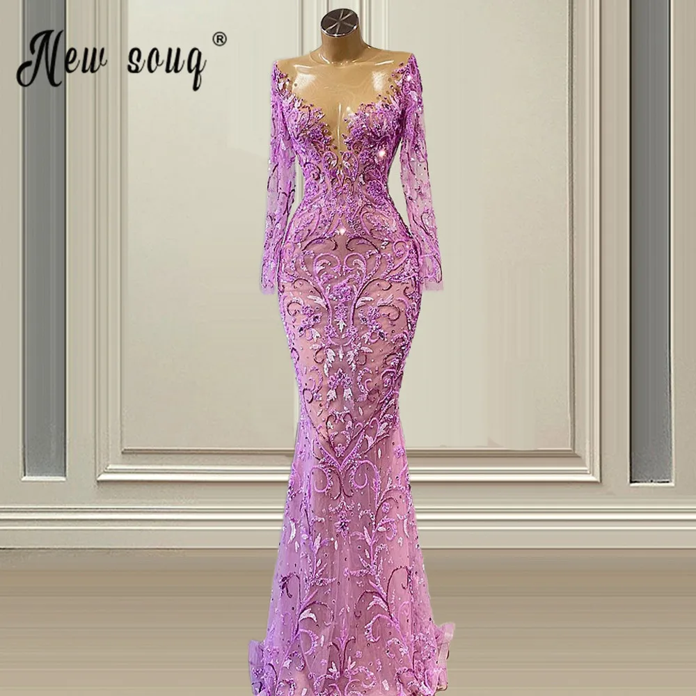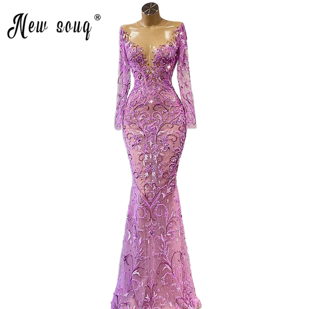 Женское вечернее платье с юбкой годе, фиолетовое кружевное платье с бисером и V-образным вырезом, длинным рукавом, платье до пола для выпускного вечера, Дубай