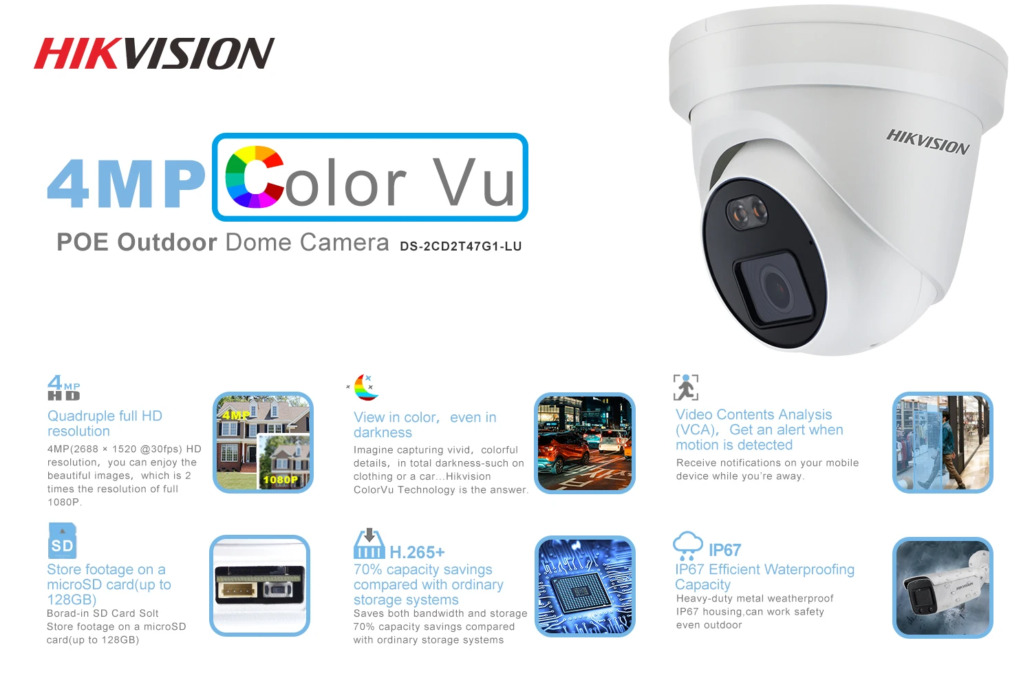 1.Hikvision ColorVu технология обеспечивает 24/7 vivid красочные изображения с F1.0 современные объективы, высокая производительность датчики и освещения. Супер-диафрагма F1.0 собирает более яркий светильник для получения более ярких изображений. Передовая Сенсорная технология может значительно улучшить использование доступного светильник. В сценах нулевой светильник, встроенный, теплый дополнительный светильник ing работает, чтобы гарантировать красочные изображения