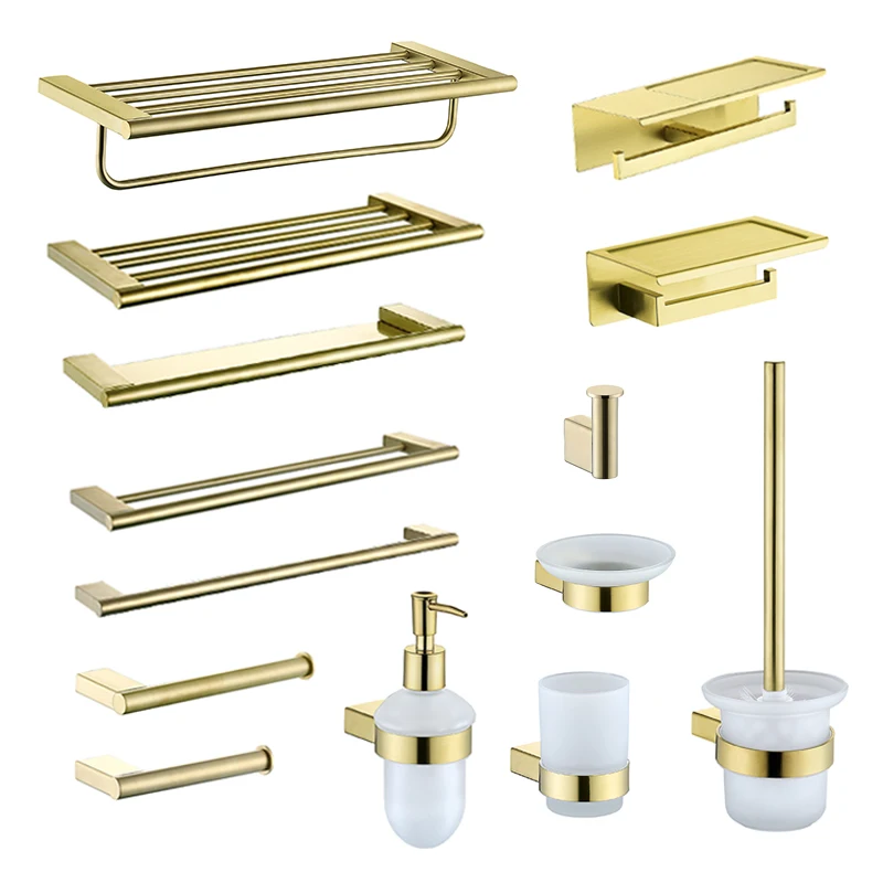 Особенности и характеристики:Набор оборудования для ванной комнатыКрючок для халата, бумажный держатель, полотенцесушитель, вешалка для полотенец, полка для хранения, стакан и подстаканник, мыльница, дозатор для мыла, держатель для туалетной щеткиМатериал: нержавеющая сталь SUS304Использование: ванная комната/душевая комната/туалетЦвет: матовый золотойТип: аксессуары для ванной комнатыУстановка: НастенныйВключая все монтажные фитинги