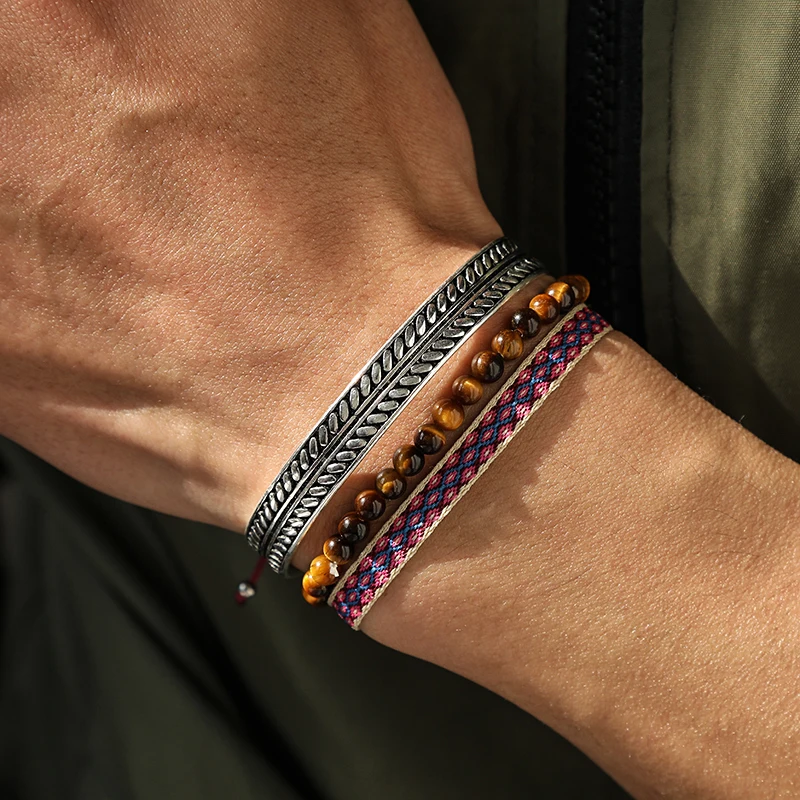 Модный браслет с листьями и покрытием из серебра 925 пробы, богемные браслеты с бусинами тибетского глаза, простая веревочная цепочка для мужчин, набор ювелирных изделий, подарки