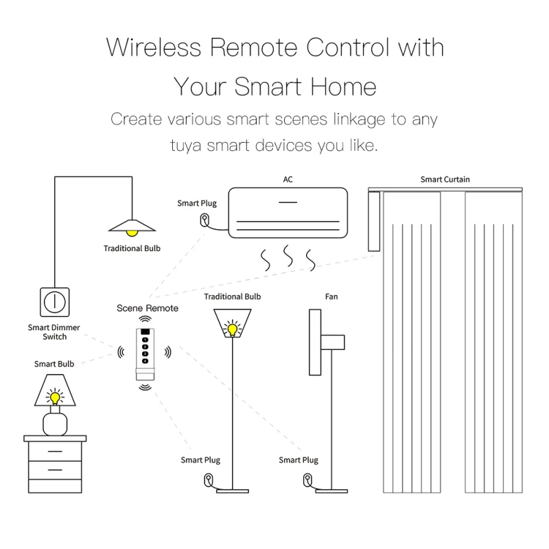 1. Умный автоматический беспроводной пульт дистанционного управления Tuya ZigBee на любые умные устройства Tuya в приложении Smart Life для установки различных сцен для вашей умной жизни. Нажмите-to-run, чтобы получить еще один более легкий контроль для всех смарт-устройств Tuya с одной клавишей на пульте дистанционного управления. Каждая кнопка переключения может удовлетворить несколько потребностей, Реализуя различные сцены. Вообразите умную связь, чтобы создать бесконечное пространство с проводным переключателем сцены.