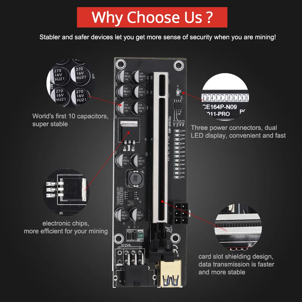Посылка включает в себя:1/5/6/10 шт переходная карта PCI-E (с 1/5/6/10 шт PCI-E светодиодный чип, 1/5/6/10 шт USB 3,0 кабель).