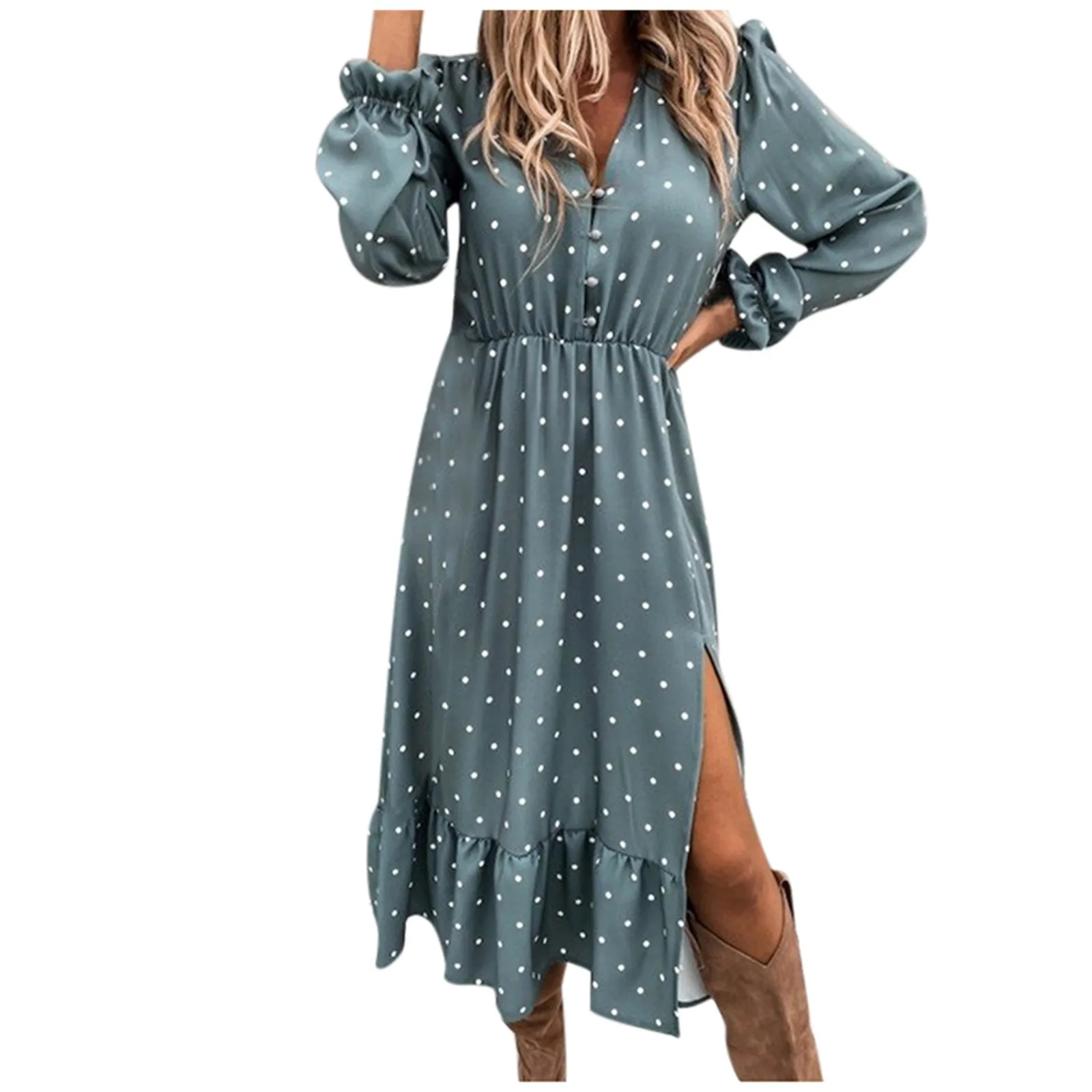2021 модное и удобное платье в горошек с v-образным вырезом и длинными рукавами
