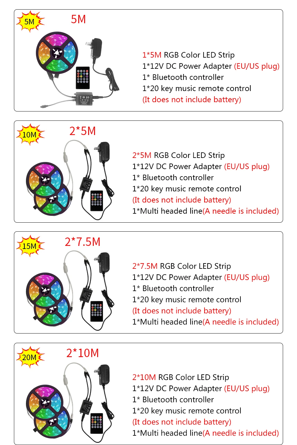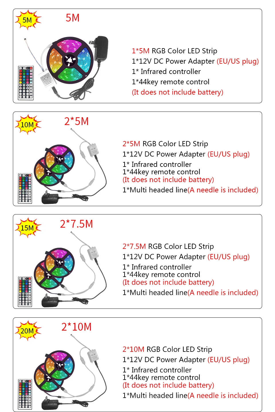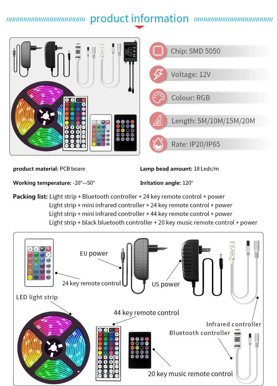 1. RGB 5050 светодиодные ленты (5M-1rolls * 5 м 10M-2 рулонов * 5 м 15M-2 рулонов * 7,5 м 20M-2 рулонов * 10 м)