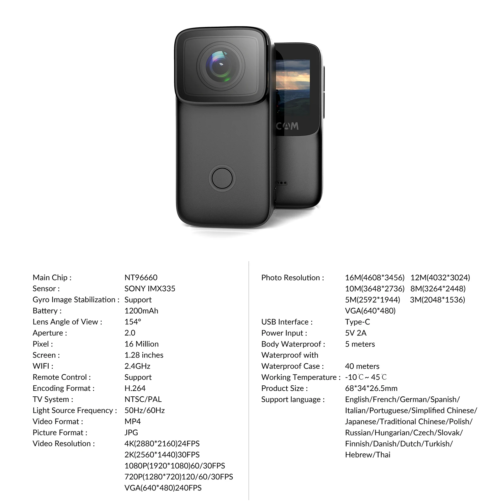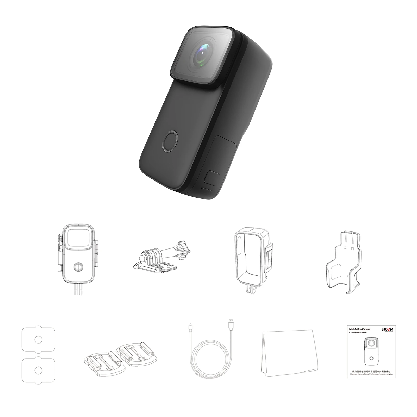 Небольшой корпус и большие функции, оснащенные сенсором высокого разрешения 4K, Экшн-камера SJCAM C200 mini предоставит вам более четкие изображения. Попрощайтесь с размытием и энергией. SJCAM C200 использует технологию горизонтальной и вертикальной двусторонней съемки, прорвав самоизготовление.Особенности:Экшн-камера 4K:Принимает датчик изображения с высоким разрешением, поддерживает 4K/24fps Запись видео в формате HD; 6-axis противоударная конструкция обеспечивает более стабильную и более гладкая запись изображения; функция ночного видения позволяет записывать замечательные видео даже ночью.Компактный и легкий корпус камеры:Размер корпуса уменьшается более чем на 23% по сравнению с обычной камерой, и более чем на 25% меньше веса, легко носить с собой, бесплатно записывать в любое время в любом месте.Водонепроницаемый дизайн для подводной съемки:Водонепроницаемый класс IPX8, 40 м Водонепроницаемый глубина с Водонепроницаемый чехол и 5 м без Водонепроницаемый чехол, отличное Водонепроницаемый производительность делает его пригодным для большинства водных видов спорта, как, например, дайвинг, серфинг, плавание, кемпинг, И т. д.Встроенная перезаряжаемая батарея:Встроенный аккумулятор емкостью 1200 мА · ч, длительный срок службы батареи и аккумулятор можно быстро заряжать через прилагаемый usb-кабель для зарядки, очень удобный для активного отдыха.Различные практические аксессуары:Поставляется с различными практичными монтажными аксессуарами, такими как Опорное основание, крепление рамы, зажим, основание шлема и т. д. Что позволяет установить экшн-камеру где-то и запечатлеть лучшие моменты вашей жизни.Характеристики:Бренд: SJCAMМодель: C200Цвет:Черный/белый (опционально)Основной чип: NT96660Сенсор: IMX335Стабилизация изображения: ПоддержкаАккумулятор: 1200 мАчУгол обзора объектива: 154 °Диафрагма: 2,0Пиксель: 16 миллионовЭкран: 1,28 дюймаWiFi: 2,4GПульт дистанционного управления: ПоддержкаФормат видео: MP4Формат изображения: JPGРазрешение видео: макс. 4K(2880*2160) 24fpsРазрешение фото: макс. 16 м (4608*3456)Интерфейс USB: Type-CВходная мощность: 5 В 2 АКарта памяти: TF карта, макс. 128 гЯзык поддержки: английский, французский, немецкий, испанский, итальянский, португальский, упрощенный китайский, традиционный китайский, японский, польский и т. д.Рабочая температура: от-10 ℃ до 45 ℃Камера Размеры: 6,8*3,4*2,65 см/2,7*1,3 * 1inУпаковочный лист:1 * Экшн-камера1 * Водонепроницаемый Чехол1 * поддерживаемая база1 * крепление рамы1 * зажим3 * наклейки2 * Основание для шлема1 * USB кабель для зарядки1 * салфетка для очистки1 * Руководство пользователя