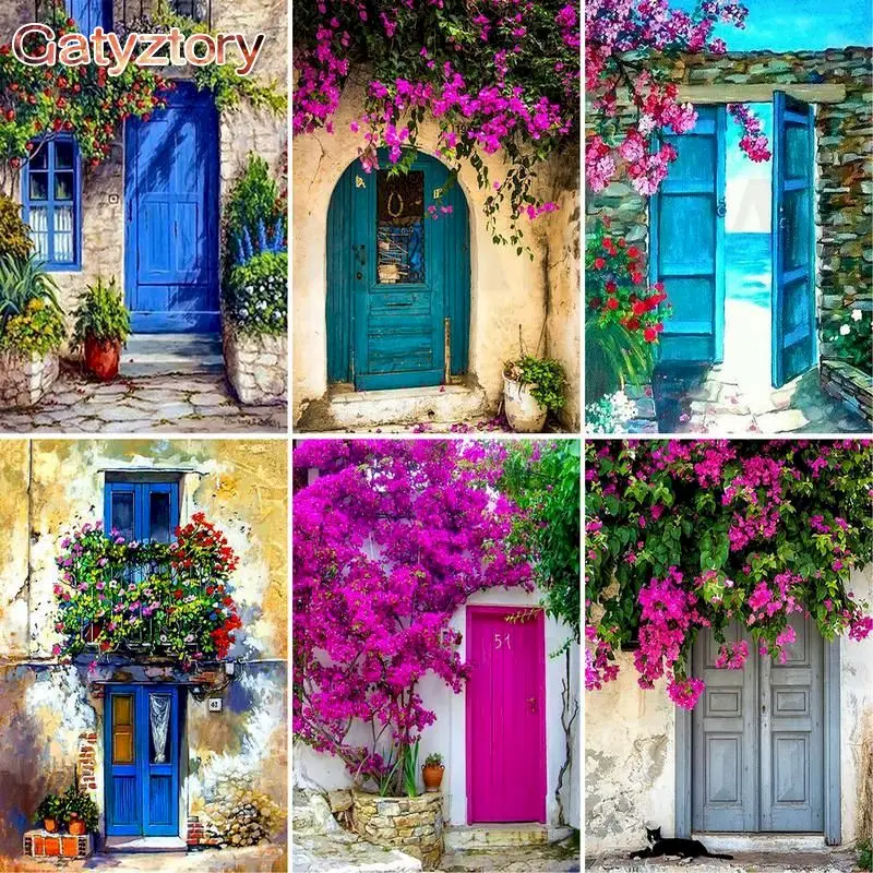 GATYZTORY краска с изображением синей двери пейзажа по номерам для взрослых детей ручная краска маслом рисование на холсте рисование на стену Декор 60x75c