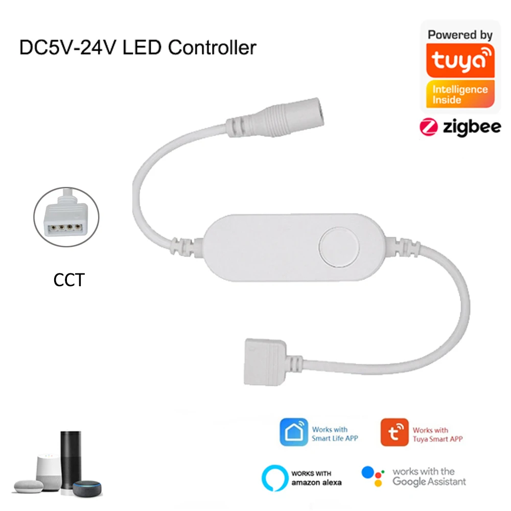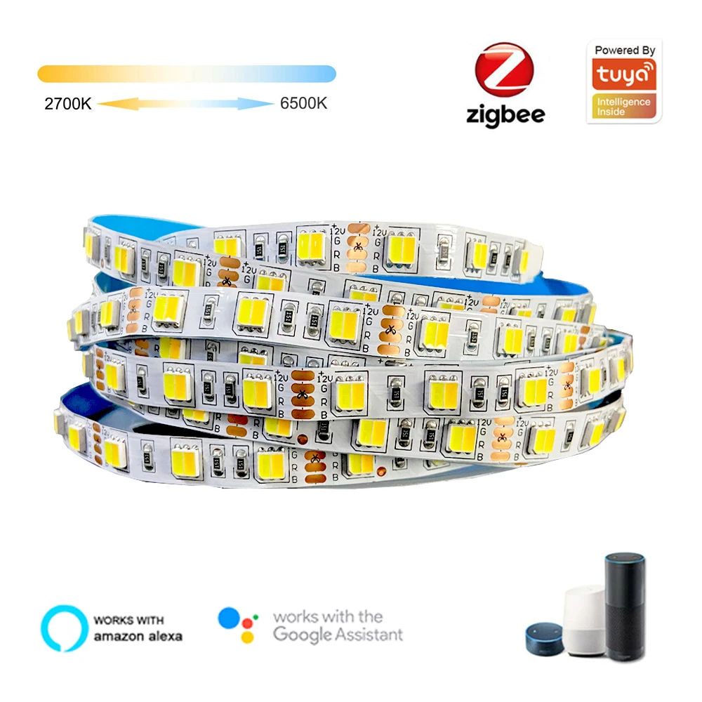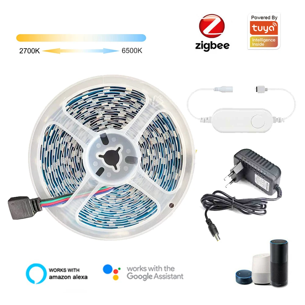 Светодиодная лента Tuya Zigbee Smart CCT, 5 м, 10 м, 5050, двойной белый, 2 в 1, теплый белый и белый + мини-пульт управления + 12 В питания Echo Plus, голосовое управление