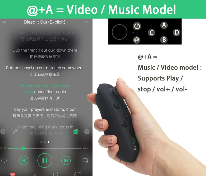 Этот товар представляет собой многофункциональный телефон пульт управленияМногофункциональный дизайн, может использоваться как селфи-затвор, геймпад, беспроводная мышь,Музыкальный контроллер, чтение учебниковНебольшой размер и легкий вес, можно карманить и носить с собой куда угодноОдна кнопка для переключения режимаДиапазон Bluetooth: 2 - 10 мВремя работы: 10 чПосылка1 х контроллер телефона2. Батарейки в комплект не входят. Покупатель должен покупать их отдельно. Тип батареи: AAAИгра для IOS: новая игра/ICADE, два вида моделейНе требует взлома и загрузки, поддерживает систему iosПоддержка IOS VR: bofeng mojing/3d bobo1. Новая Модель игры, загрузка клавиш start + X, загрузка игрового контроллера игровой комнатыИз двухмерного кода, новый симулятор тура2. Модель ICADE, запуск + загрузка ключа, Загрузка игры icade из app store.3. Bofeng mojing,start + A key boot, на bofeng mojing select Mocute gamepad, выберите модель игры4. 3d bobo, запуск + загрузка ключа, загрузка 3D BOBO с двухмерного кодаИгра для Android: геймпад/запатентованный протокол/три вида протоколов MTKAndroid VR :Bofeng mojing/3d bobo/chengzi vrЕсли у вас есть смартфоны на Android MTK, совместимость плохая. Вам нужна модель MTK.Стандартная модель: START + A BOOT,MTK Модель: START + Y BOOT.Bluetooth 3,0 пульт дистанционного управления беспроводной затвор игровой геймпад для 3D VR Glases Shinecon TV Box iPhone IOS Samsung Android