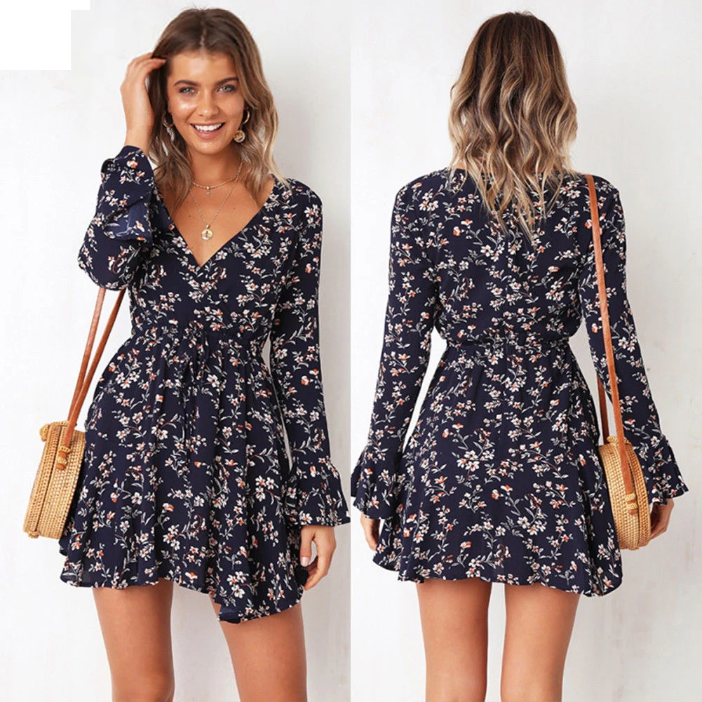 Женское короткое платье с V-образным вырезом, длинным рукавом