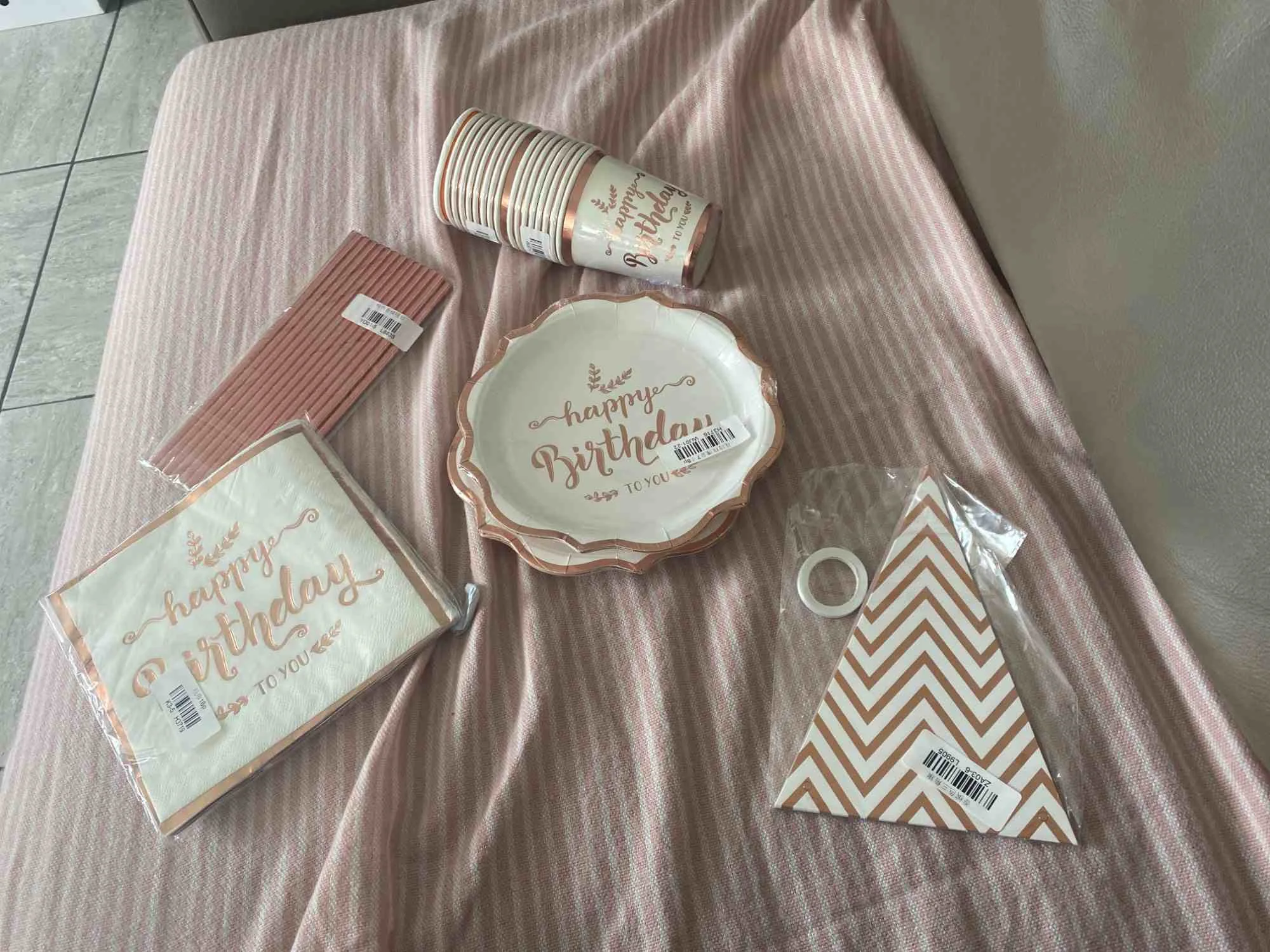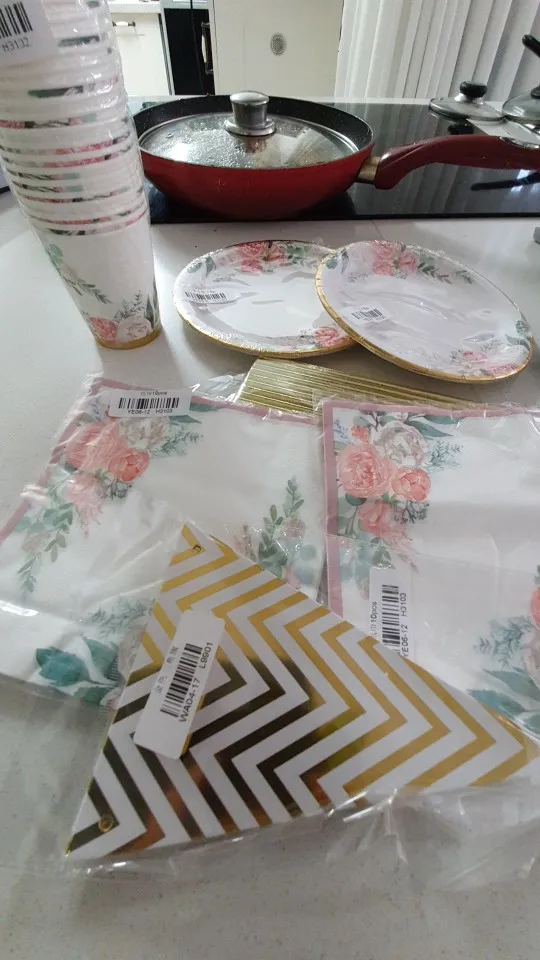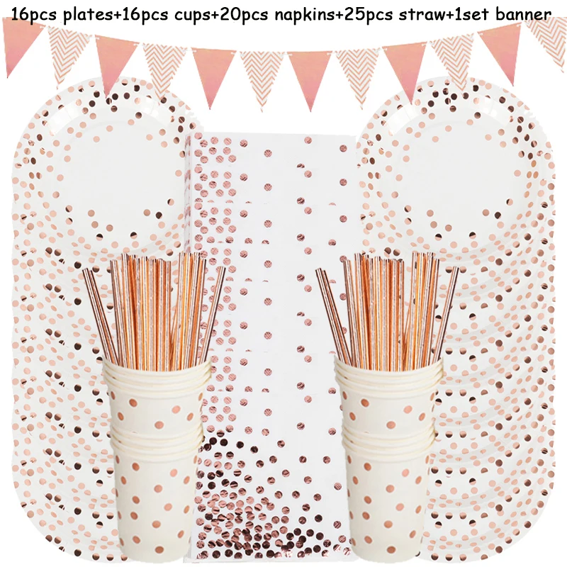 74 шт. Комплект посуды K, в том числе: 16 шт. 7 дюймов пластины + 16 шт. чашки + 1 пакет 16 шт. салфетки + 25 шт. Соломинки + 1 комплект баннер