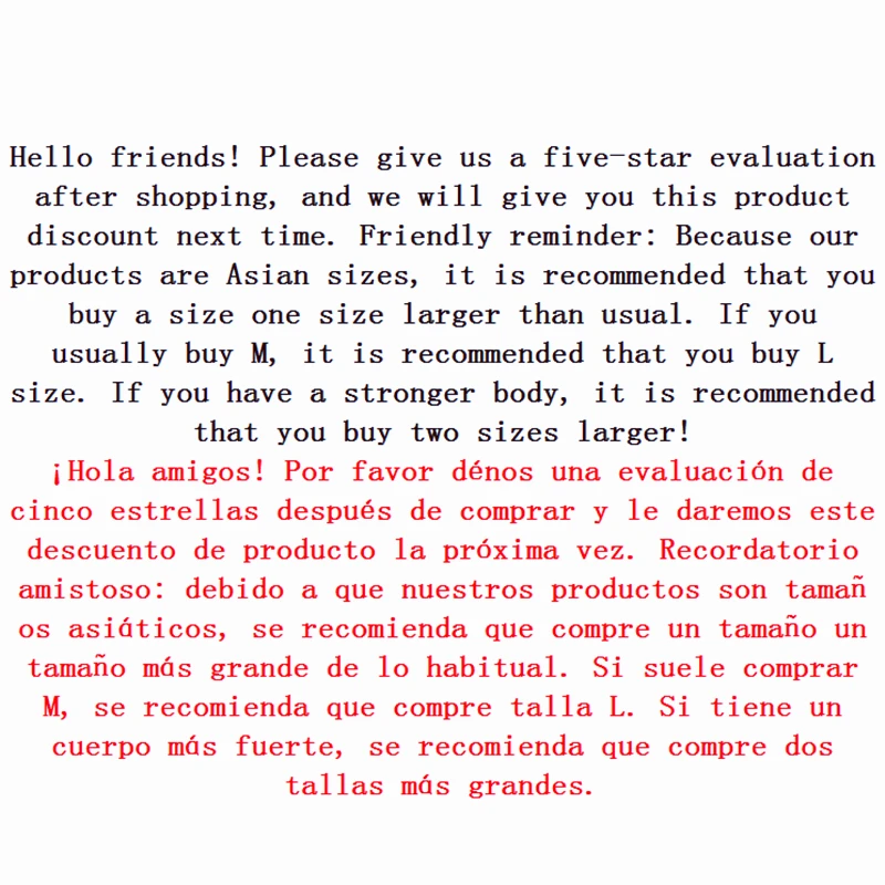 Пожалуйста, обратите внимание! Поскольку наша продукция представлена в азиатских размерах, мы рекомендуем вам купить рубашку на один размер больше, когда вы размещаете заказ. Если вы обычно покупаете M Размер, здесь я предлагаю вам купить L размер, и так далее ~
