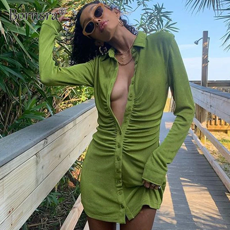 Женское мини-платье на пуговицах, с отложным воротником и длинным рукавом