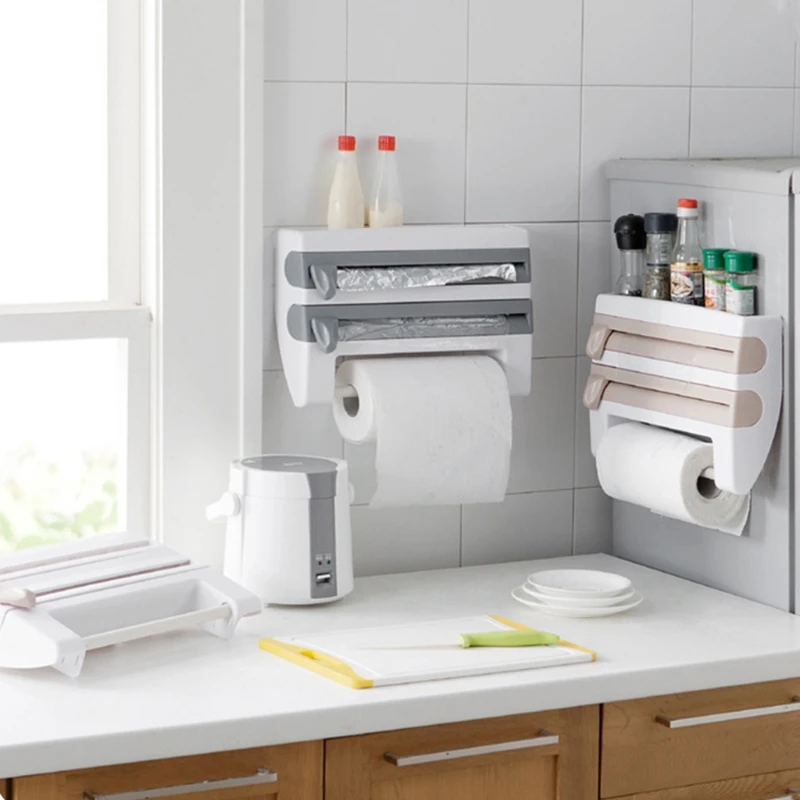 Новый 4 в 1 Кухня бумага для органайзера Полотенца держатель цепляться соусница с стеллаж для хранения для резки пленки держатель хранения ювелирных изделий, отрезной стойке пленка
