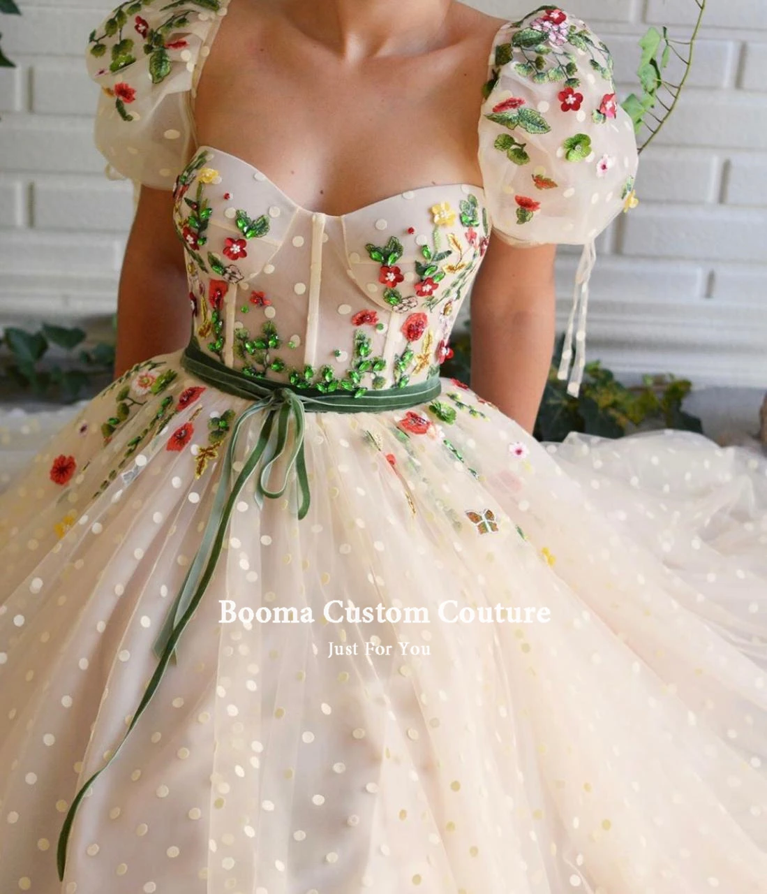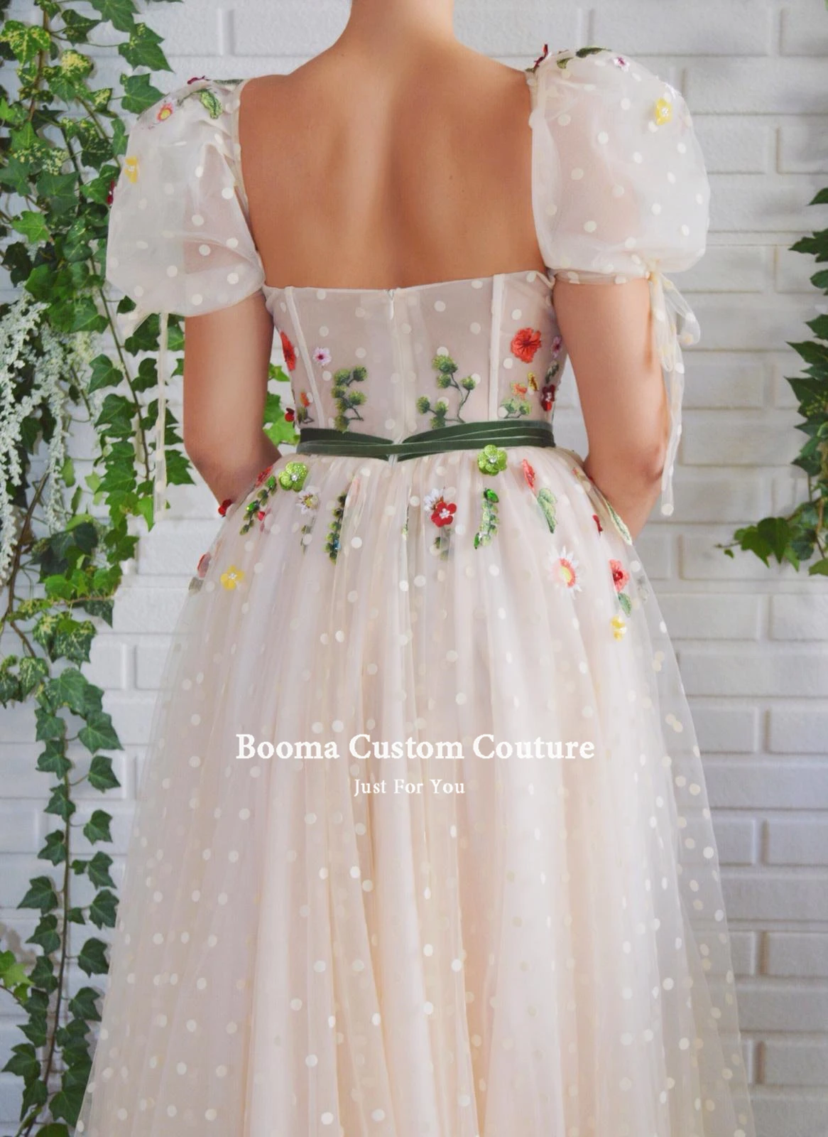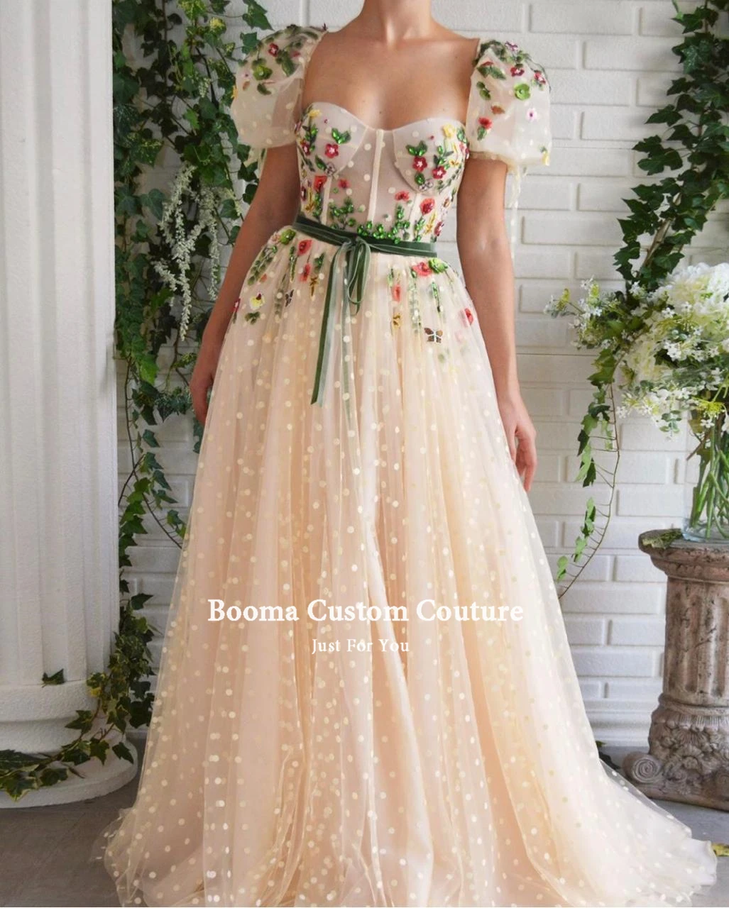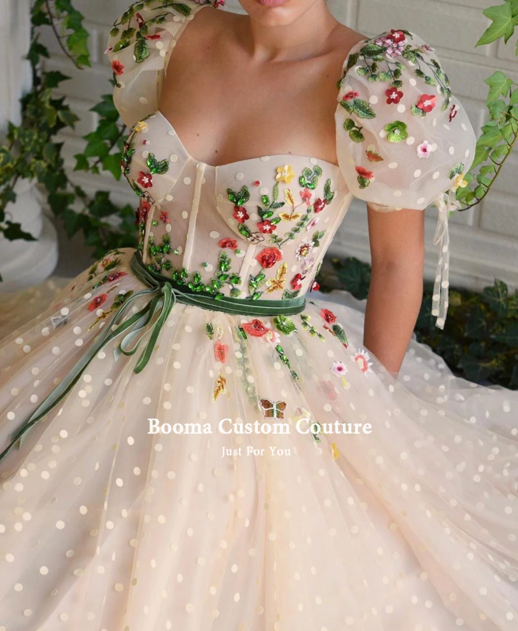 Кремовое платье в горошек Booma, Тюлевое платье для выпускного вечера, с короткими рукавами-фонариками, с цветами, Кристаллами, ТРАПЕЦИЕВИДНОЕ, для свадебной вечеринки, с поясом, 2021
