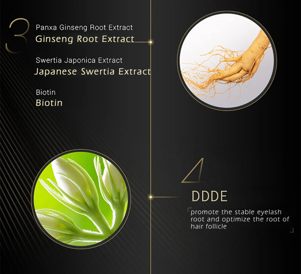 1. Myristica ароматизаторы Myristoyl PentapeptideБыстрое восстановление волосяного фолликула способствует естественному удлинению ресниц и эффективно уменьшает падение феноменов Сью до старения DHT.2. БиотинВитамин H, коэнзим предотвращает падение себорроевых ресниц способствует регенерации волос и нормальной работе.3. Экстракт корня женьшеня4. DDDEПродвигайте стабильный корень ресниц и оптимизируйте корень волосяного фолликула.5. Биотиноил Tripetide-1Улучшает экзоплазму, например, синтез коллагена IV и мукопротеина 5, и оптимизирует структуру волосяного фолликула. Хорошо подходит для укрепления волоса и волосяных фолликулов дермы.