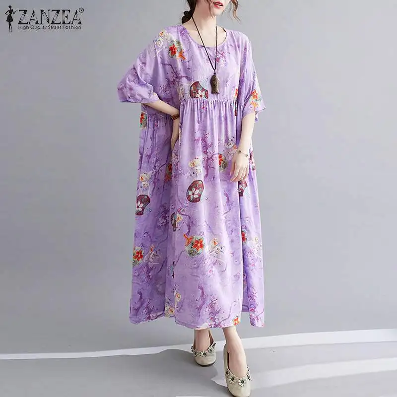 Модное Цветочное платье до середины икры, Женский плиссированный сарафан ZANZEA 2021, повседневные летние платья с принтом, женское праздничное платье