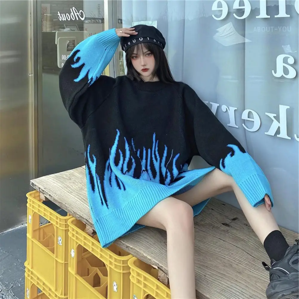 Новинка 2020, свободный зимний и осенний пуловер с длинным рукавом и синим пламенем, Женский Свитер оверсайз, фиолетовый женский пуловер, женские свитера, Джерси для женщин