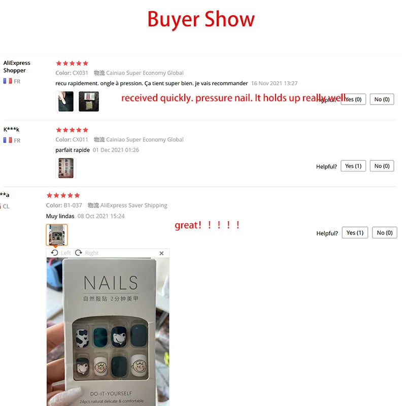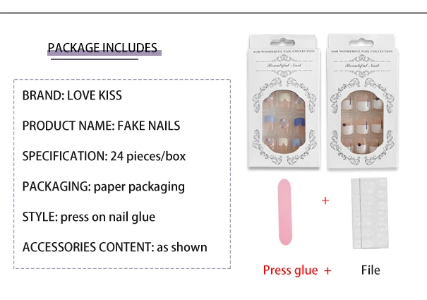 Посылка включает в себя:24 шт./кор. накладные ногти + Пресс клей