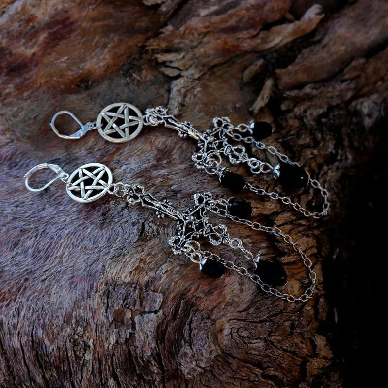 Гот перевернутый распятие длинные серьги в форме слезы черного цвета с украшением в виде кристаллов с рисунком пентаграммы ведьма заявление гранж Классическая сатаны языческих для женщин подарок
