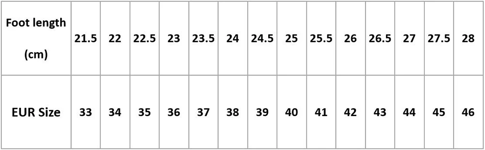 Длина стопы 21,5 (см) = EUR Размеры 33Длина стопы 22,0 (см) = Европейский размер 34Длина стопы 22,5 (см) = EUR Размер 35Длина стопы 23,0 (см) = Европейский Размер 36Длина стопы 23,5 (см) = EUR Размеры 37Длина стопы 24,0 (см) = Европейский Размер 38Длина стопы 24,5 (см) = EUR Размеры 39Длина стопы 25,0 (см) = европейский размер 40Длина стопы 25,5 (см) = EUR размер 41Длина стопы 26,0 (см) = европейский размер 42Длина стопы 26,5 (см) = EUR размер 43Длина стопы 27,0 (см) = европейский размер 44Длина стопы 27,5 (см) = EUR Размеры 45Длина стопы 28,0 (см) = европейский размер 46