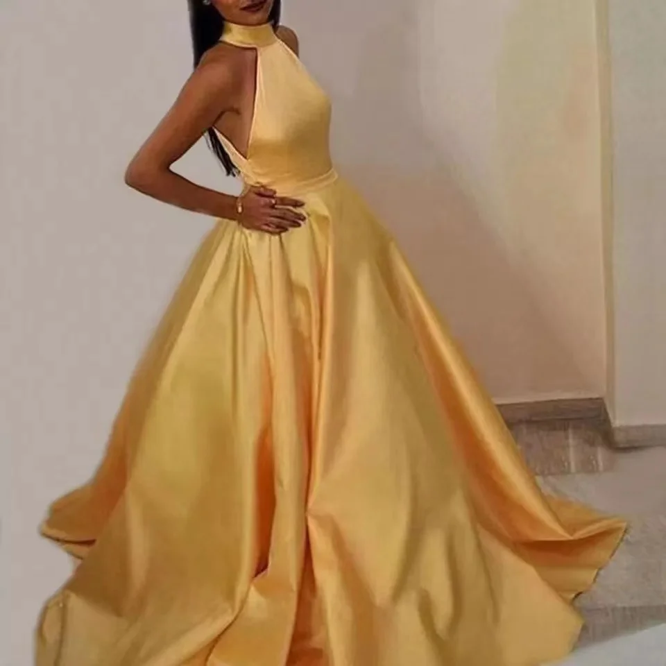 Женское атласное вечернее платье It's yiiya, желтое бальное платье с лямкой на шее на лето 2019