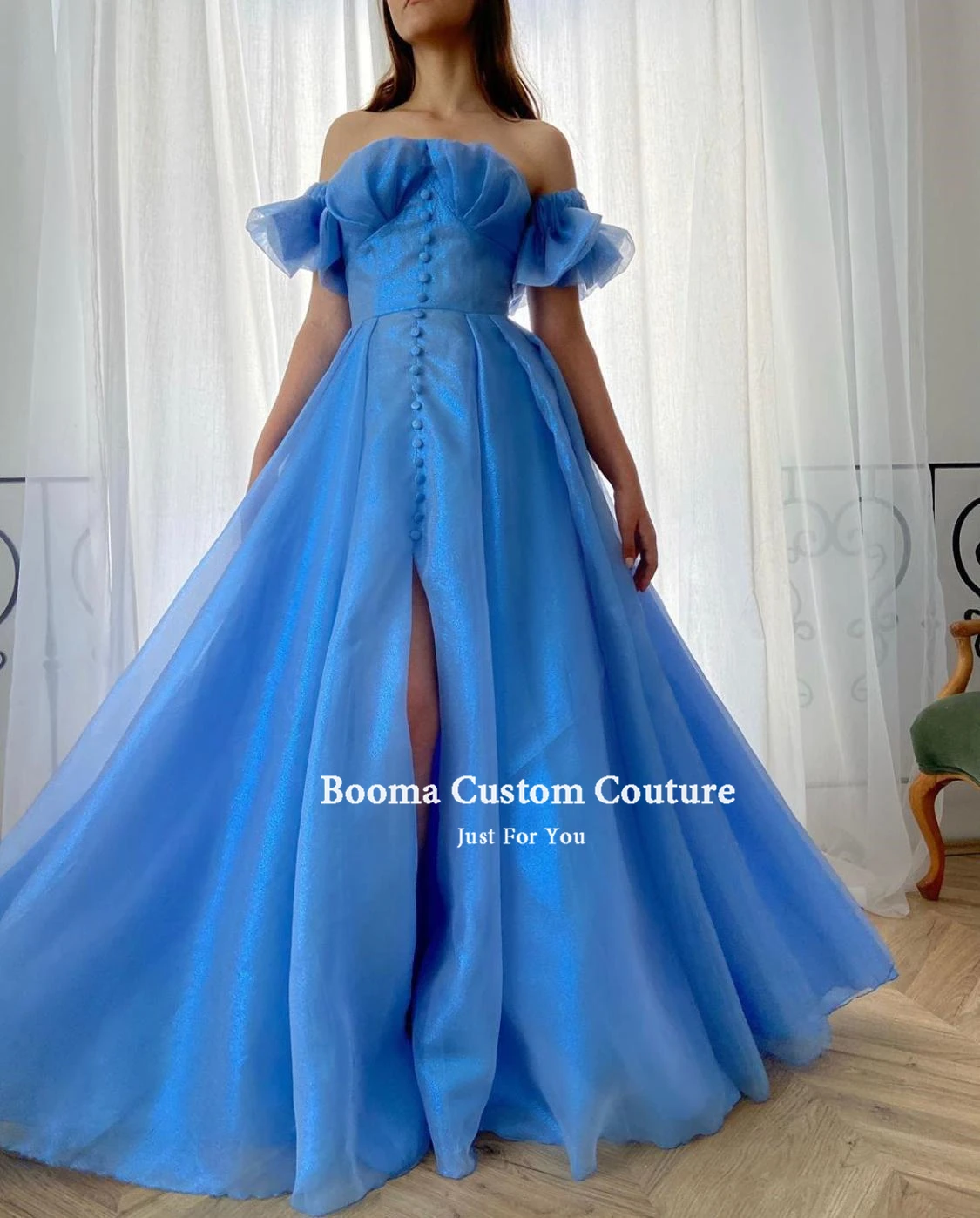 Booma голубое платье из органзы Макси Выпускные платья с рукавами-фонариками с открытыми плечами платье трапециевидной формы нарядные платья для свадьбы кнопки высокий разрез платья для выпускного бала