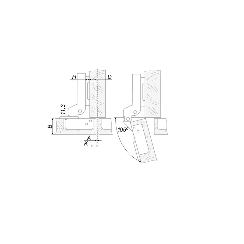 Петля мебельная вкладная с доводчиком предназначена для крепления дверей из ДСП. Может также применяться с любой деревянной мебелью. Устанавливается под углом 90 ? по типу надвижного монтажа (Slide-on). В комплектацию входит петля и ответная планка без крепежа. Диаметр чашки составляет 35 мм, которая крепится на саморезы. Допустимое смещение отверстий – до 6 мм.