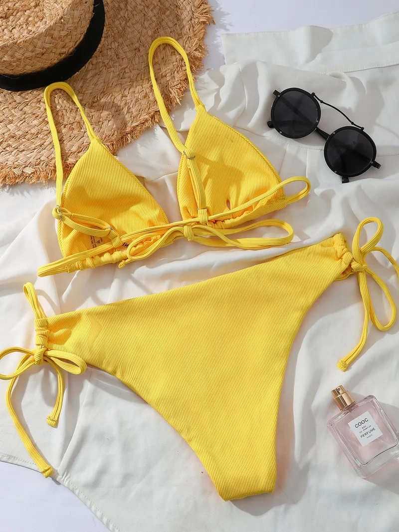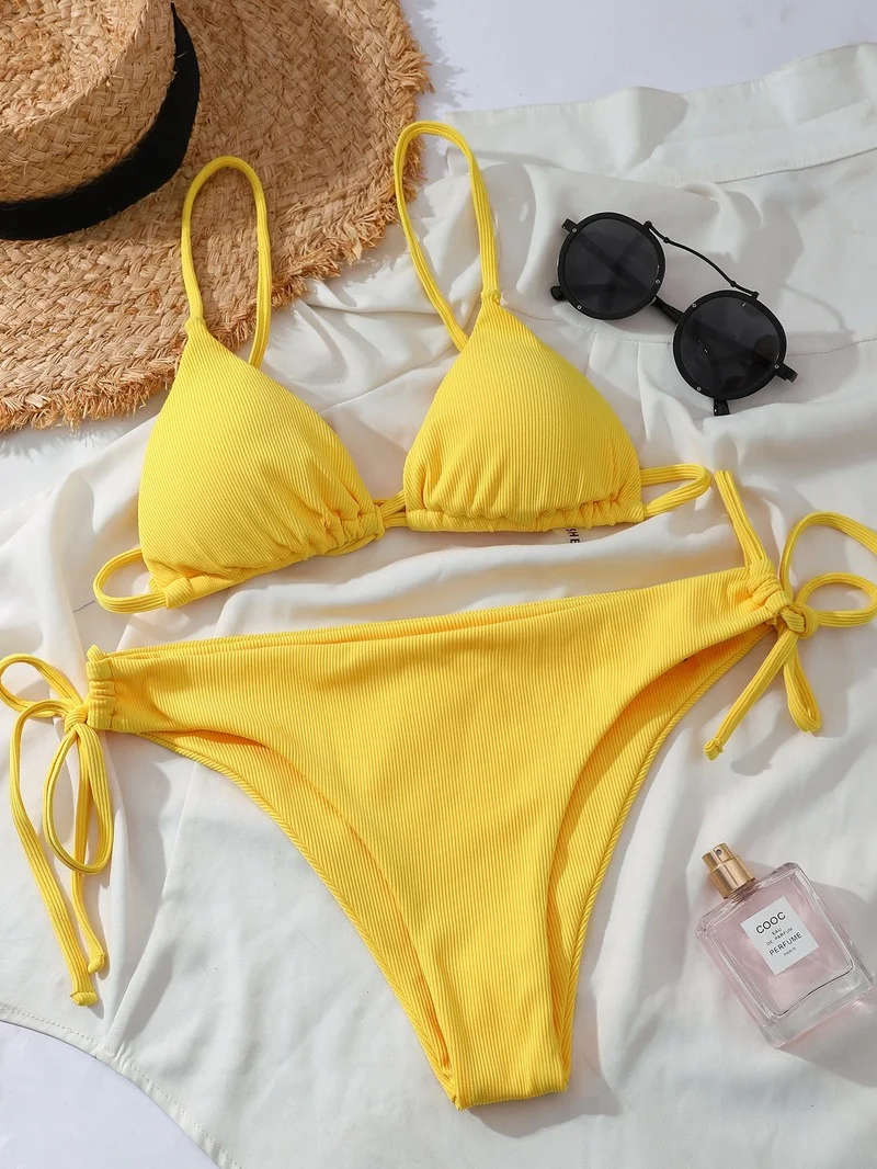 Сексуальный комплект бикини желтый в рубчик, 2021, женский бюстгальтер пуш-ап, микро стринги, бикини, Женский треугольный купальник, купальный костюм для женщин