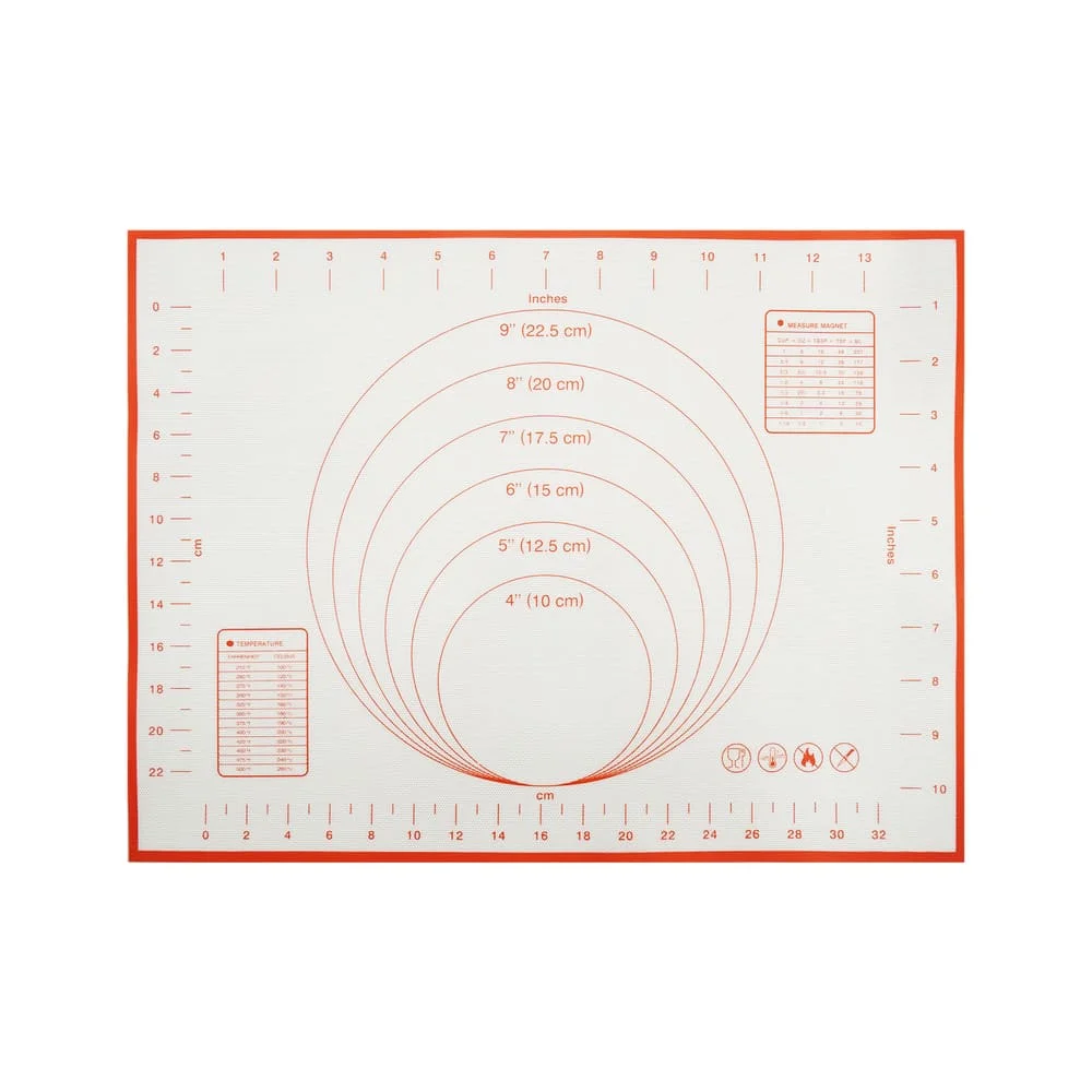 Силиконовый коврик для выпечки, O'Kitchen, выдерживает температуру от -40°C до +230°C. Подходит для выпечки и заморозки. Легко моется, не впитывает запахи и компактно складывается. На изделие нанесена специальная разметка в виде окружностей различных диаметров (от 10 до 22,5 см), таблица мер и весов, а также линейка с дюймами и сантиметрами по краям. С силиконовым ковриком выпечка не будет прилипать и подгорать. Размер: 40х30 см.