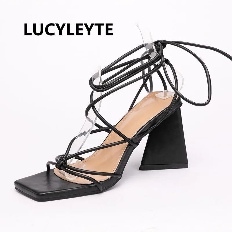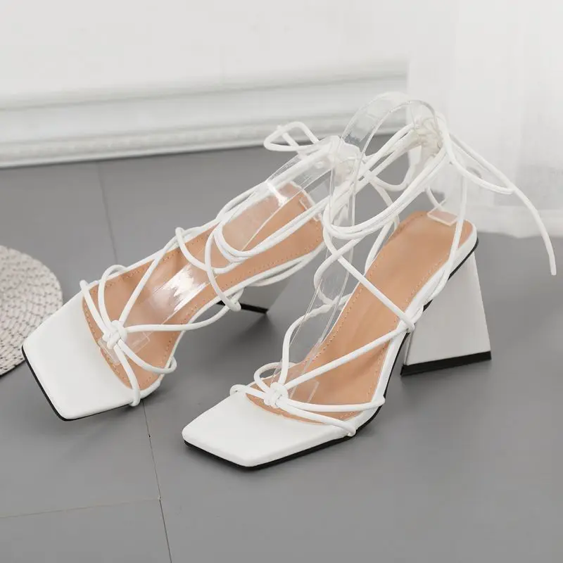 2021 Модные женские ботинки на твердом квадратном Летняя женская обувь с открытым носком, сандалии женские ботильоны из PU искусственного материала (PU) с перекрестной шнуровкой на среднем каблуке Женская обувь в сдержанном стиле; Большие размеры 35-42; Zapatos Mujer